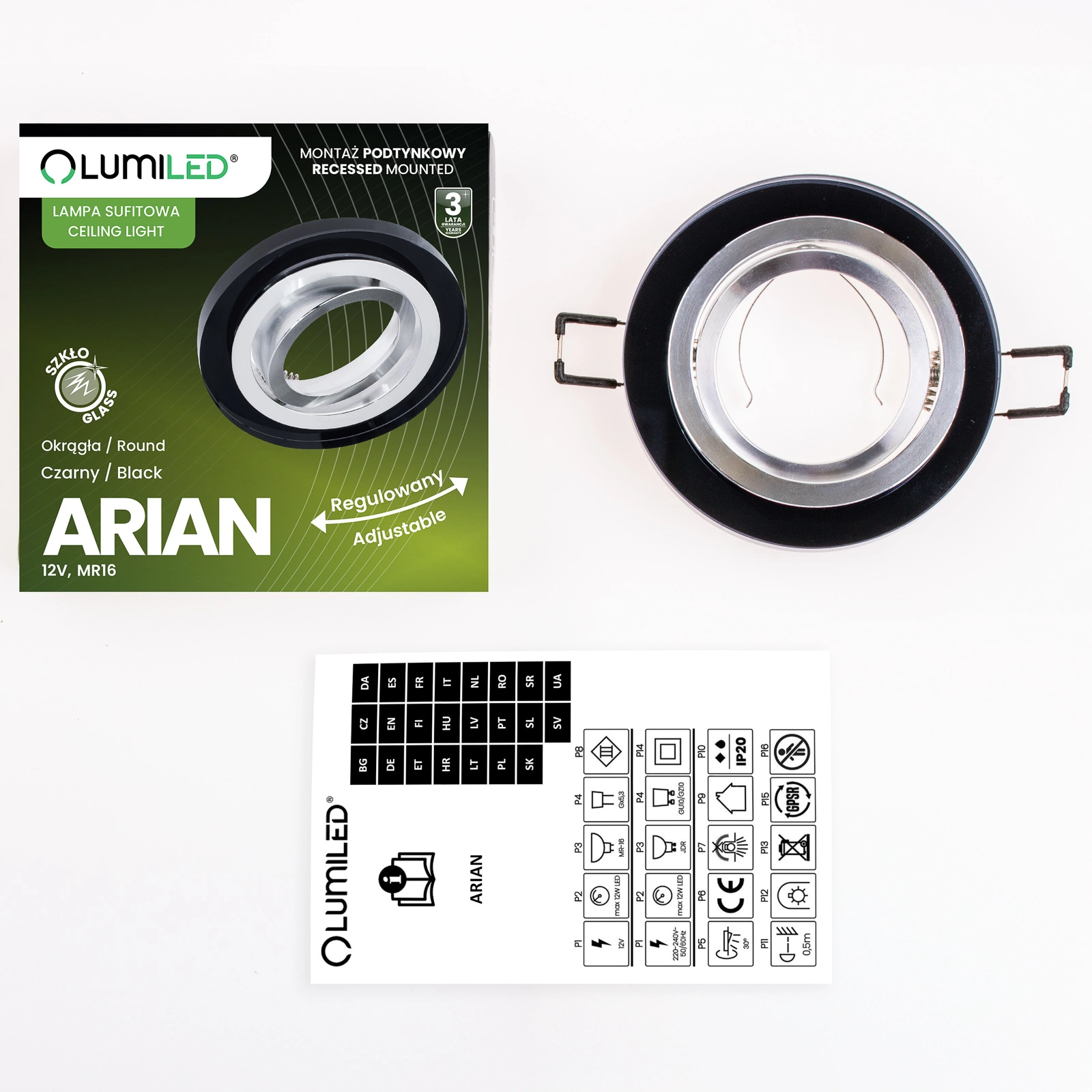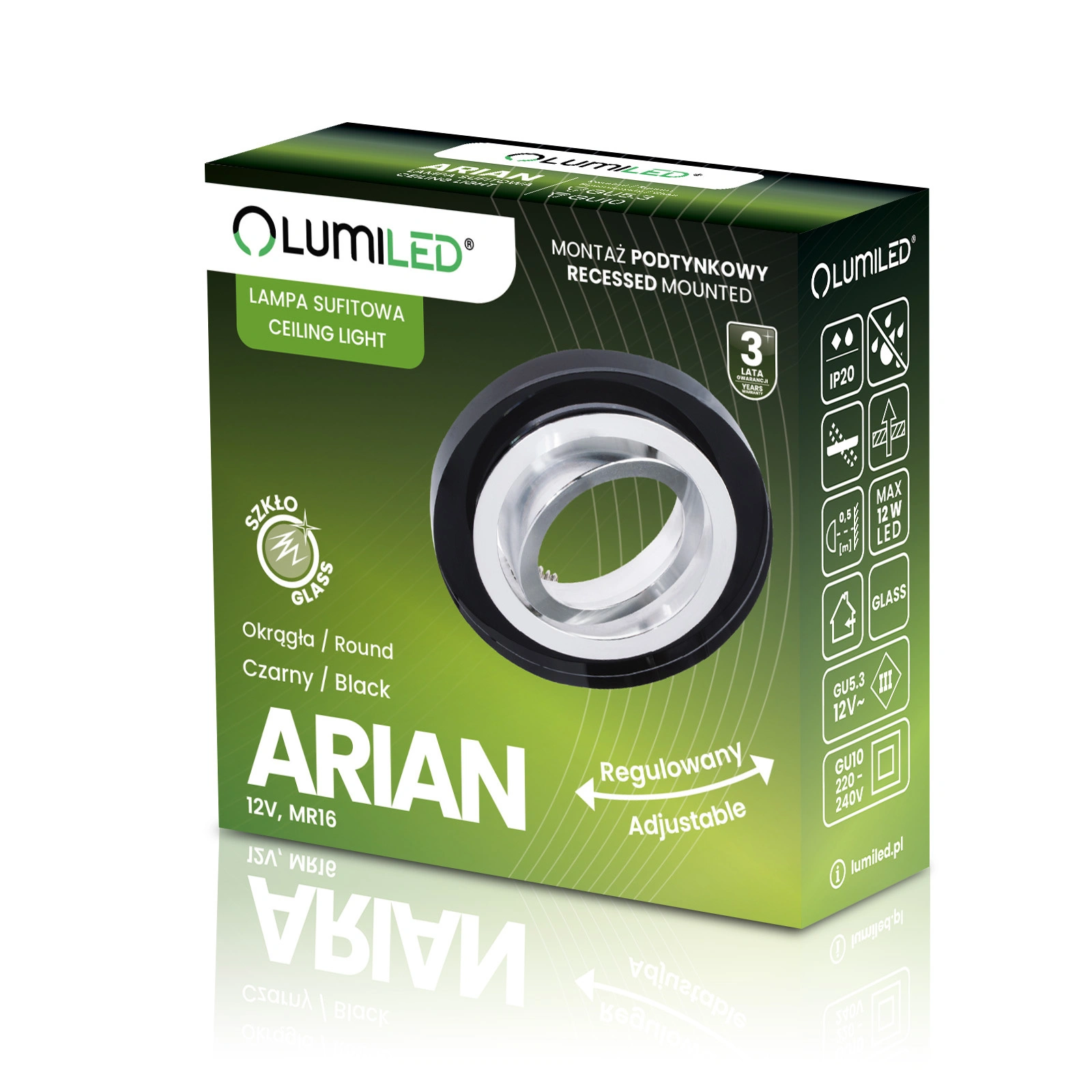 Halogenové svítidlo ze série ARIAN je úhledné skleněné svítidlo , které bylo uzpůsobeno pro práci s LED žárovkami s paticí MR16 nebo GU10 . Kulaté svítidlo je vyrobeno z kvalitního skla, které se krásně kombinuje se stříbrnými prvky z hliníku. Černé svítidlo se bude skvěle vyjímat v moderních i klasických interiérech. Pohyblivé svítidlo má schopnost nastavit úhel osvětlení , což vám umožní nasměrovat světelný paprsek tam, kde je to potřeba. Černé stropní svítidlo bude vypadat úžasně na každém stropě a kombinace několika takových svítidel vám umožní vytvořit dokonalý zavěšený strop.