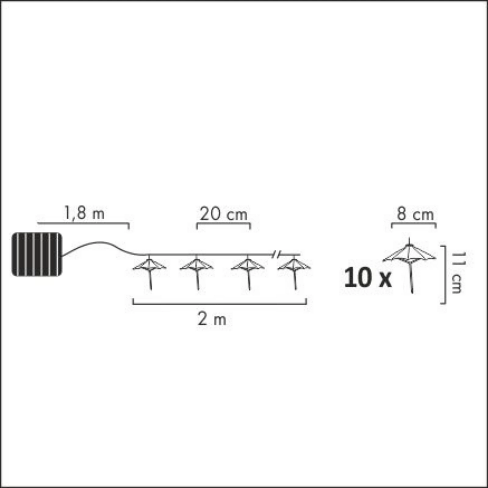 Solární girlanda s 10 barevnými deštníky od společnosti POLUX bude sloužit jako dekorativní a praktické osvětlení vaší zahrady. Originální tvar solárních svítidel dokonale zvýrazní společnost větších zelených rostlin.
