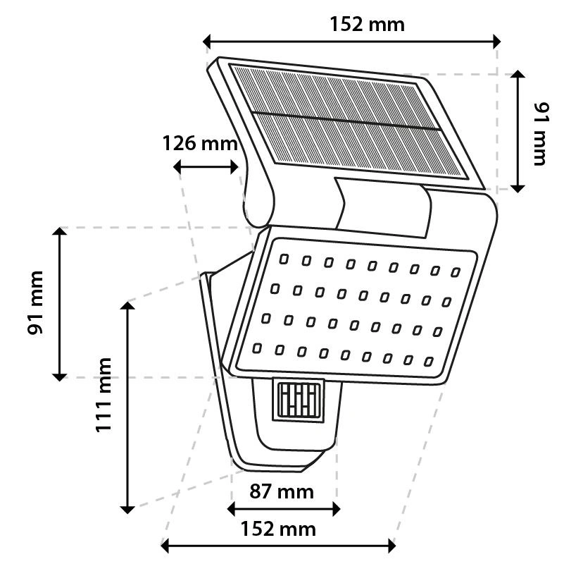 Solární lampa je vybavena pokročilým pohybovým čidlem a spínačem se dvěma provozními režimy, přizpůsobení individuálním potřebám uživatele. Režim "ON umožňuje svícení při 40% výkonu až po dobu 8 hodin, což zajišťuje rovnoměrné a úsporné osvětlení po celou noc. Druhý režim, "PIR", aktivuje svítidlo tak, aby svítilo na 100 % výkonu při detekci pohybu v dosahu senzoru, což výrazně zvyšuje bezpečnost a funkčnost svítidla. Po 30 sekundách nečinnosti se lampa automaticky vypne, což přispívá k úspoře energie. Díky těmto vlastnostem je solární lampa spolehlivým a účinným řešením osvětlení, ideálním pro instalaci na zahrady, příjezdové cesty nebo chodníky.