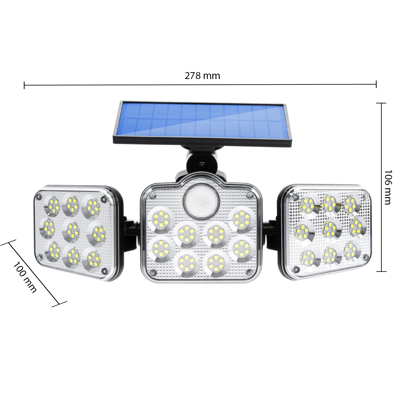 Světlomet má PIR pohybové čidlo s pracovním úhlem 120° v rozsahu 4 - 6 m. Po detekci soumraku výrobek přejde do pohotovostního režimu a vypne se, při detekci pohybu se rozsvítí na 100% jas