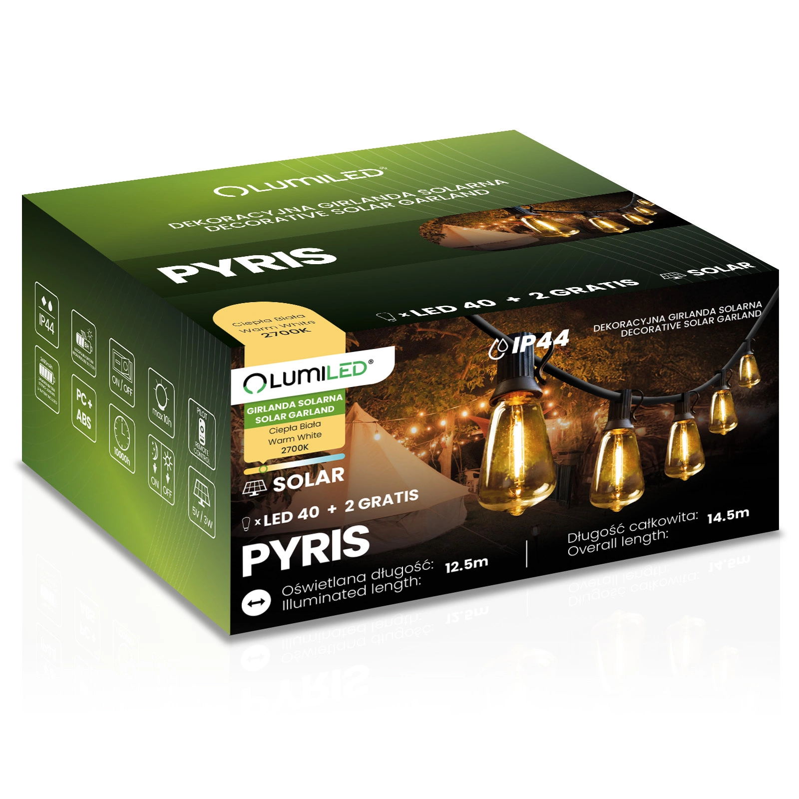 Solární girlanda Pyris od renomovaného výrobce osvětlení Lumiled je navržena tak, aby vytvořila náladovou a útulnou atmosféru. Skvěle se hodí do zahrady a díky svému elegantnímu designu může fungovat jako dekorativní i praktický zdroj světla, ideální pro altány, terasy nebo rekreační prostory.