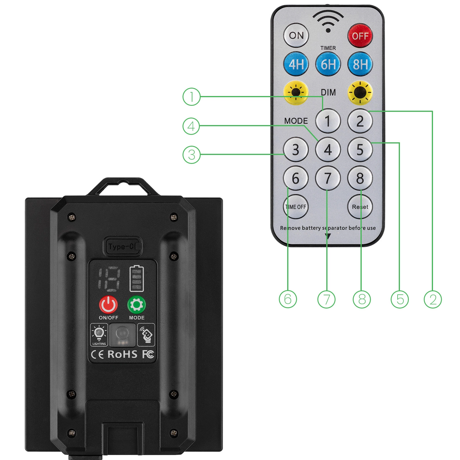 Napájení solární energiínebo prostřednictvím kabelu USB TYPE-C: Věnec je vybaven solárním panelem, který přes den ukládá solární energii, aby večer osvětlil okolí příjemným světlem. Možnost dobíjení přes kabel USB typu C navíc znamená, že osvětlení může fungovat i v zamračených dnech nebo v oblastech s omezeným přístupem slunečního světla.