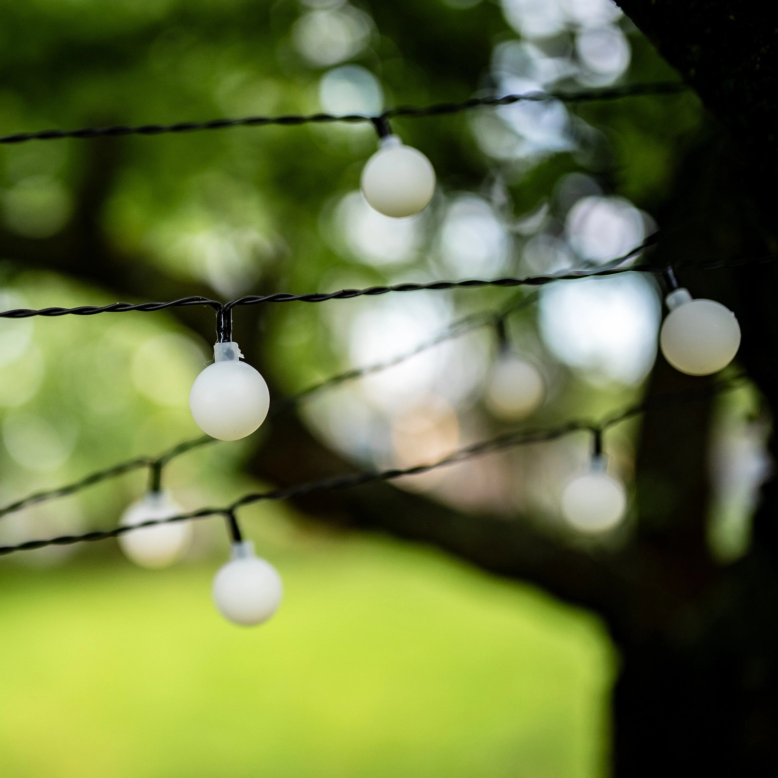 Solární girlanda SOLIX na obrázku se skládá z 50 teplých bílých diod LED umístěných v plastových mléčných koulích o průměru 2,3 cm, které jemně rozptylují světlo a vytvářejí útulnou a harmonickou atmosféru. Je ideální jako decentní osvětlení pro večerní setkání, romantické večeře venku. Bylo vytvořeno s ohledem na maximální pohodlí. Má 182 cm dlouhou černou šňůru a světla rozmístěná po 15 cm zajišťují rovnoměrné osvětlení, které vytváří konzistentní a elegantní vizuální efekt.