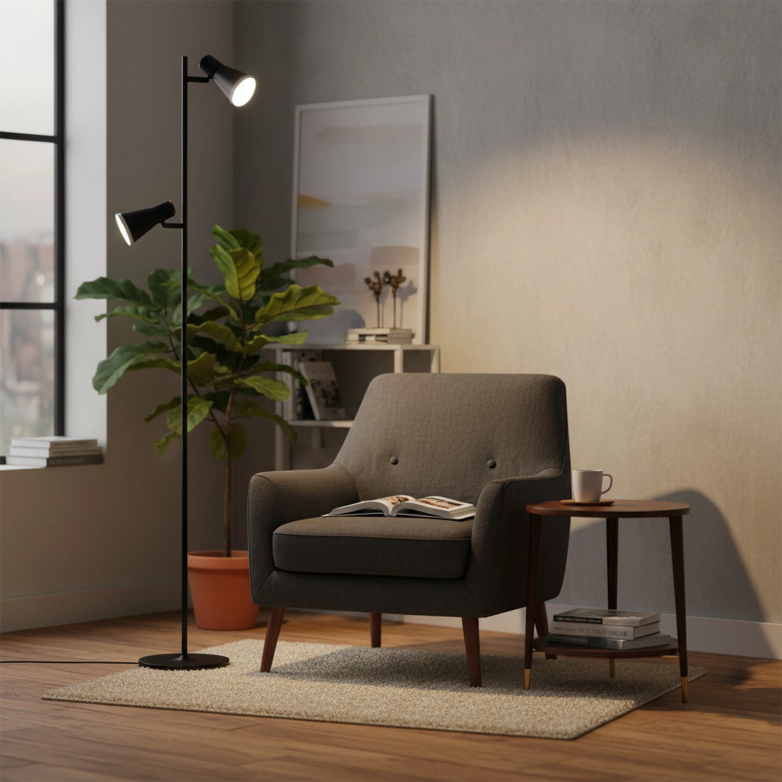 Stojací lampa se dvěma moderními 7W světelnými body se světelným tokem 880 lm a teplou barvou světla, s širokým úhlem svícení 120°. Dokáže osvětlit i tu nejtmavší místnost a navodit útulnou, příjemnou a světlou atmosféru. Lampa bude poutavou dekorací vhodnou i pro komerční prostory, jako je bar nebo atmosférická restaurace, a bude také dokonalým doplňkem moderních, okouzlujících nebo tradičních interiérů, kterým dodá šarm a změní jejich vzhled. Tato lampa je ideálním produktem pro každého, kdo si přeje ozdobit svůj domov jedinečným a netradičním doplňkem, který podtrhne originální a avantgardní design interiéru.