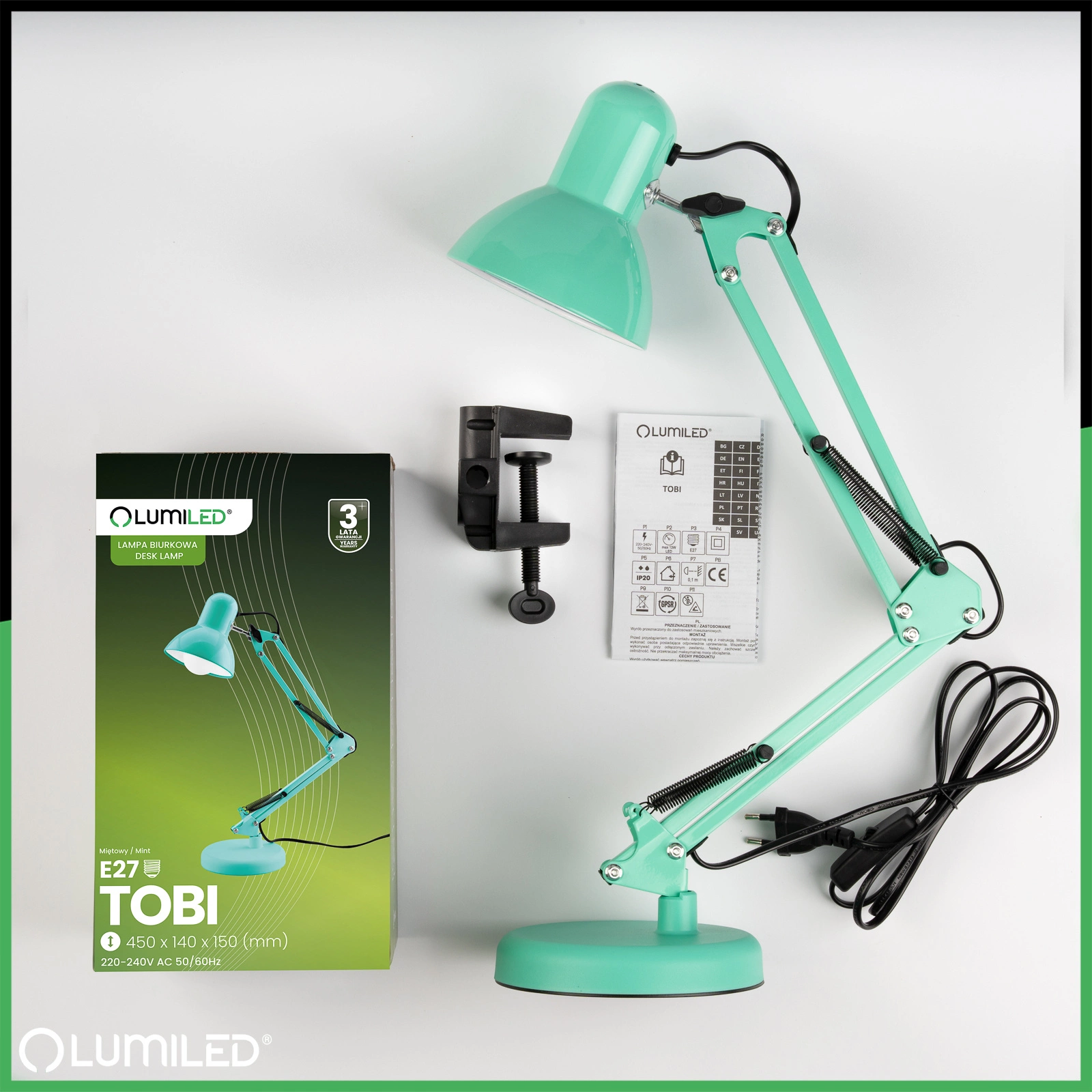 Stolní lampa na kreslení TOBI od LUMILED v barvě Mint je kombinací moderního stylu a klasické ergonomie. Díky přiloženému držáku ji můžeme přišroubovat na hranu pracovní desky různé tloušťky a součástí je i klasická patka umožňující umístění lampy kamkoli.