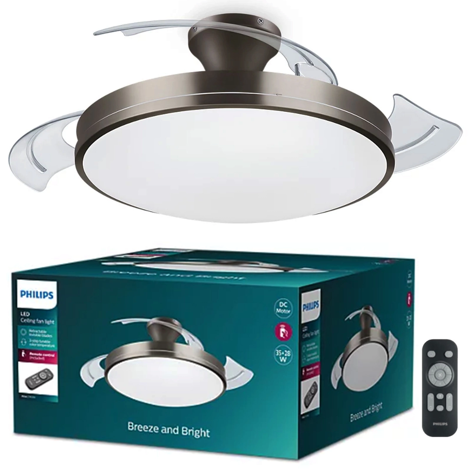 Stropní ventilátor Philips LED poskytuje v domácnosti silné, jasné a zároveň příjemné světlo, které lze ovládat přiloženým dálkovým ovladačem nebo nástěnným vypínačem.