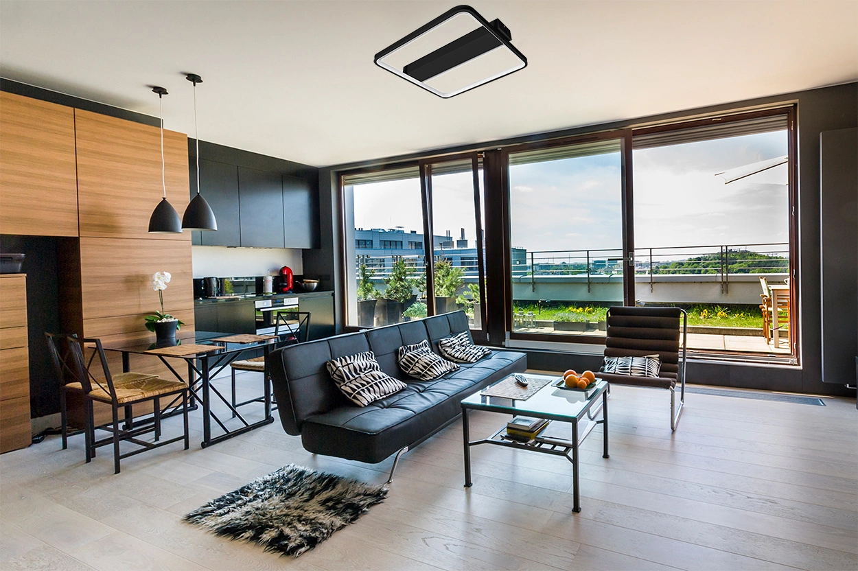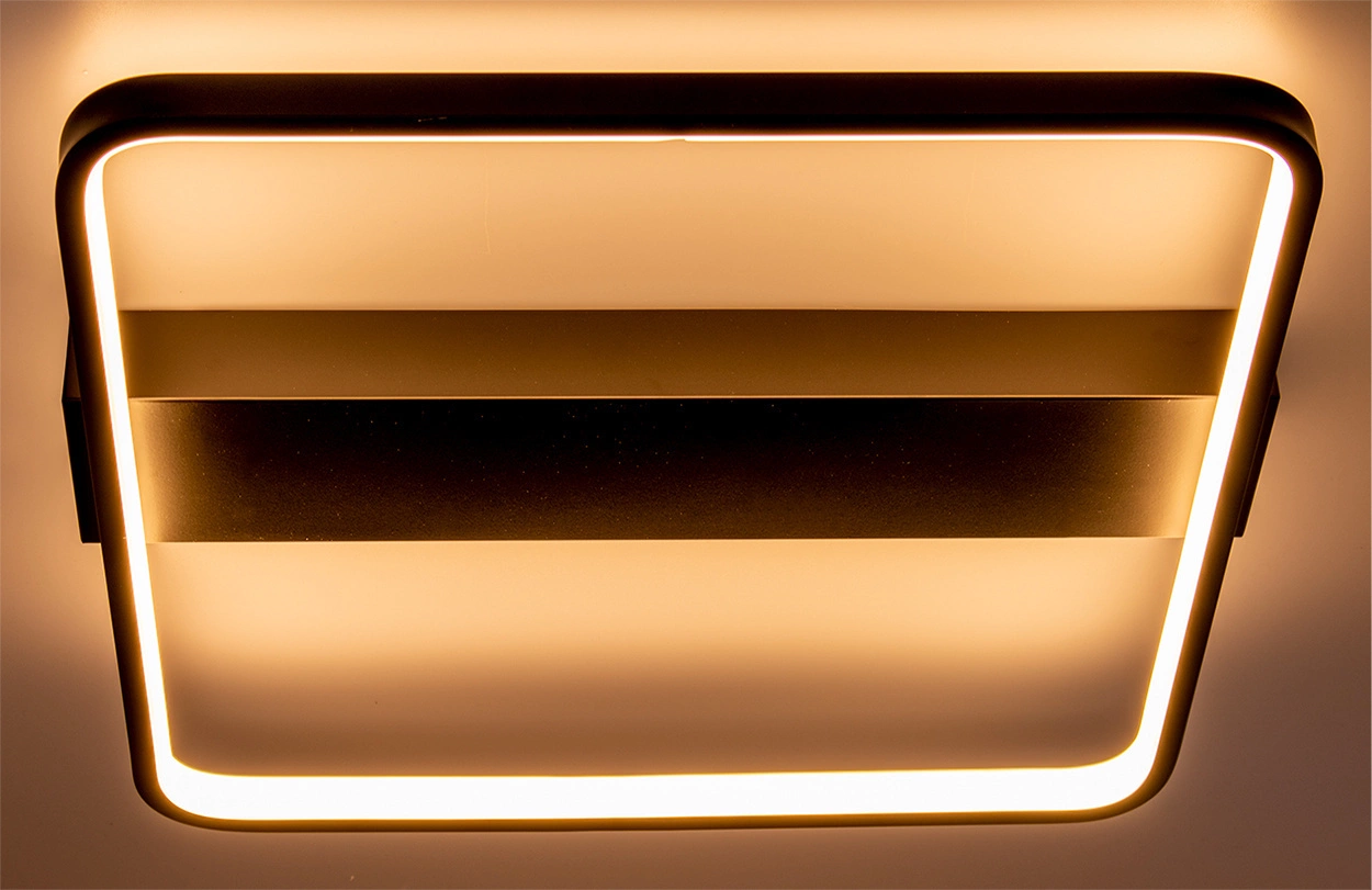 Moderní Lustr LED. Je vybaven 310 LED SMD 2835 které mají možnost stmívání a změny barvy světla. Zařízení lze regulovat pomocí speciálním dálkovým ovladačem (součástí dodávky), který umožňuje snížit nebo zvýšit intenzitu světla nebo změnit jeho barvu z teplé na neutrální nebo studenou. Dálkové ovládání funguje pomocí rádia, což znamená, že nemusíme mířit na konkrétní bod, abychom změnili nastavení.