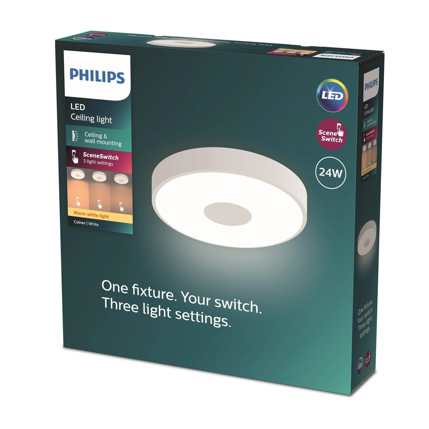 Objevte moderní eleganci se stropním svítidlem Philips Coiner LED. Díky technologii SceneSwitch nabízí toto svítidlo pohodlné přizpůsobení úrovně světla vaší náladě a poskytuje dokonalé osvětlení v každém okamžiku. Díky světelnému toku 2700 lm a barvě světla 2700 K získá prostor teplý a příjemný charakter ideální pro relaxaci i práci. Energeticky úsporné 24W svítidlo Plafond v bílé barvě se dokonale hodí do moderních interiérů a kombinuje styl a funkčnost. Díky životnosti až 20 000 hodin se můžete těšit z nepřetržitého jasu po mnoho let. Užijte si změnu atmosféry pomocí jediného svítidla, které se přizpůsobí vašim potřebám, aniž byste museli instalovat další zařízení.