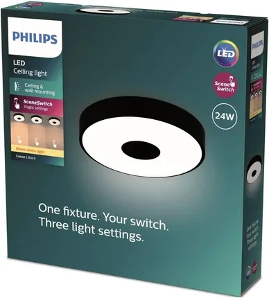 Stropní svítidlo Philips Coiner je moderní řešení osvětlení s vysokým výkonem a elegantním designem. Tento plafond LED je určen do interiérů, které vyžadují výjimečné osvětlení, a nabízí výkon 24 W a světelný tok 2800 lm, což zajišťuje vynikající osvětlení každé místnosti. Díky technologii SceneSwitch může uživatel nastavit barevnou teplotu světla až do 4000 K, což mu umožňuje vytvořit optimální atmosféru podle aktuálních potřeb - od jasného denního světla až po útulnější večerní osvětlení. Svítidlo se vyznačuje také dlouhou životností až 20 000 hodin, což z něj činí vysoce úspornou volbu na dlouhá léta. Snadno se instaluje, vyhovuje napěťovému rozsahu 220-240 V a frekvenci 50-60 Hz. Díky černému krytu v kombinaci s moderním stylem je tento model ideálním doplňkem moderních interiérů.