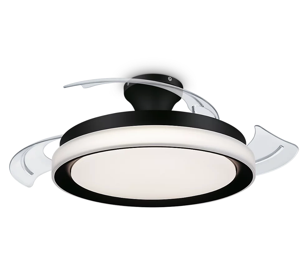 Zapomeňte na vířící stíny na stropě: tento ventilátor má zatahovací průhledné lopatky, které lze sklopit, aby v době nepoužívání nerušily.