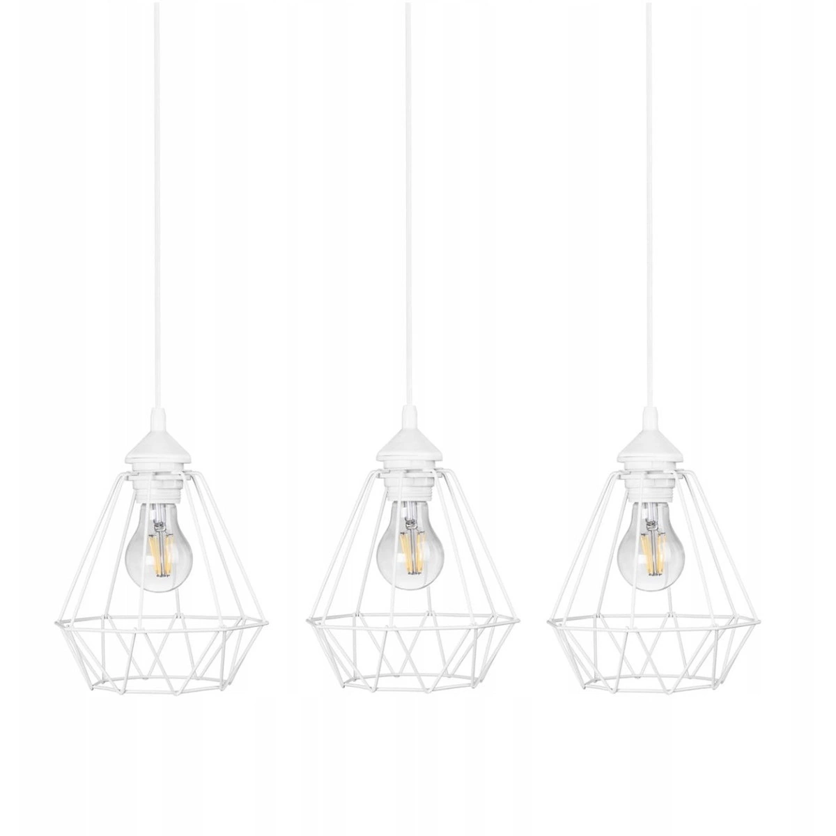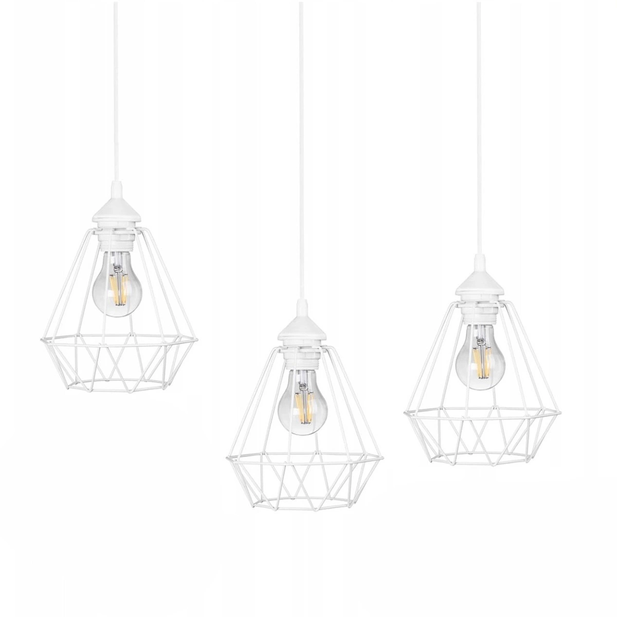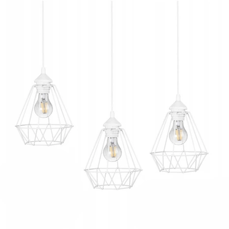 Model Loft závěsná lampa pás ve tvaru diamantu se třemi světelnými zdroji dodá vašemu interiéru neotřelý a jedinečný nádech. Díky jedinečné kombinaci bílé barvy s geometrickými tvary stínidel působí celá lampa velmi stylově a elegantně. Vyzařované světlo jedinečným způsobem proniká kovovou otevřenou formou stínidel a příjemně rozzáří celou místnost. Vynikajícího efektu lze docílit, pokud do lampy namontujete dekorativní žárovky s viditelným dekorativním vláknem, např. typu Edison. Tato lampa je ideálním produktem pro každého, kdo chce svůj domov ozdobit jedinečným a netradičním doplňkem, který podtrhne originální a avantgardní design interiéru. Skvěle vypadá v industriálním, minimalistickém a skandinávském stylu.