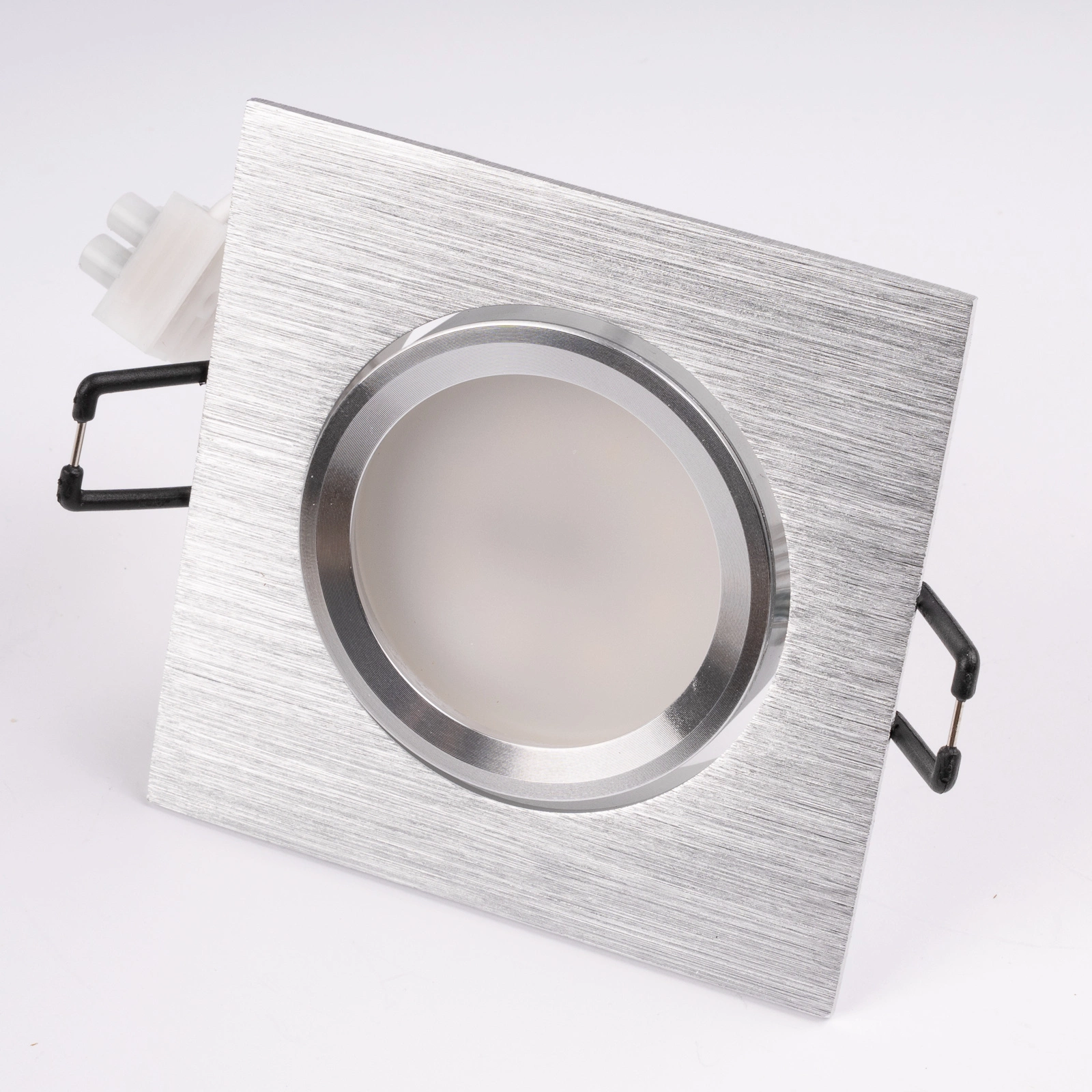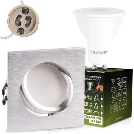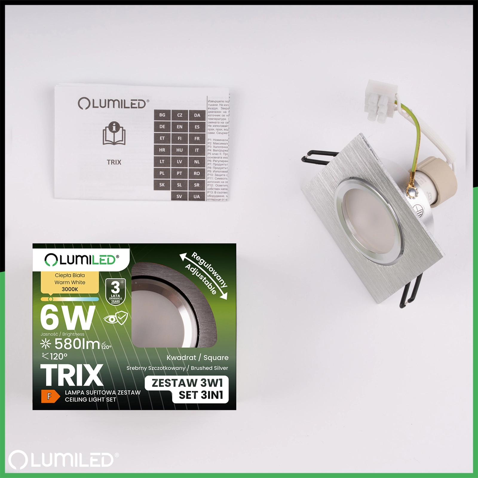 Čtvercové stropní svítidlo Lumiled TRIX v kartáčované stříbrné barvě je kompletním řešením 3 v 1 - sada obsahuje zápustnou montáž, 6W LED žárovku GU10 a montážní blok. Díky tomu je výrobek okamžitě připraven k instalaci a nevyžaduje žádné další nákupy. Teplá barva světla 3000K vytváří příjemnou atmosféru podporující relaxaci a nastavitelný držák umožňuje nasměrovat světlo do požadovaných oblastí. Jedná se o všestranné osvětlení, které spojuje funkčnost a estetiku v jediném výrobku.