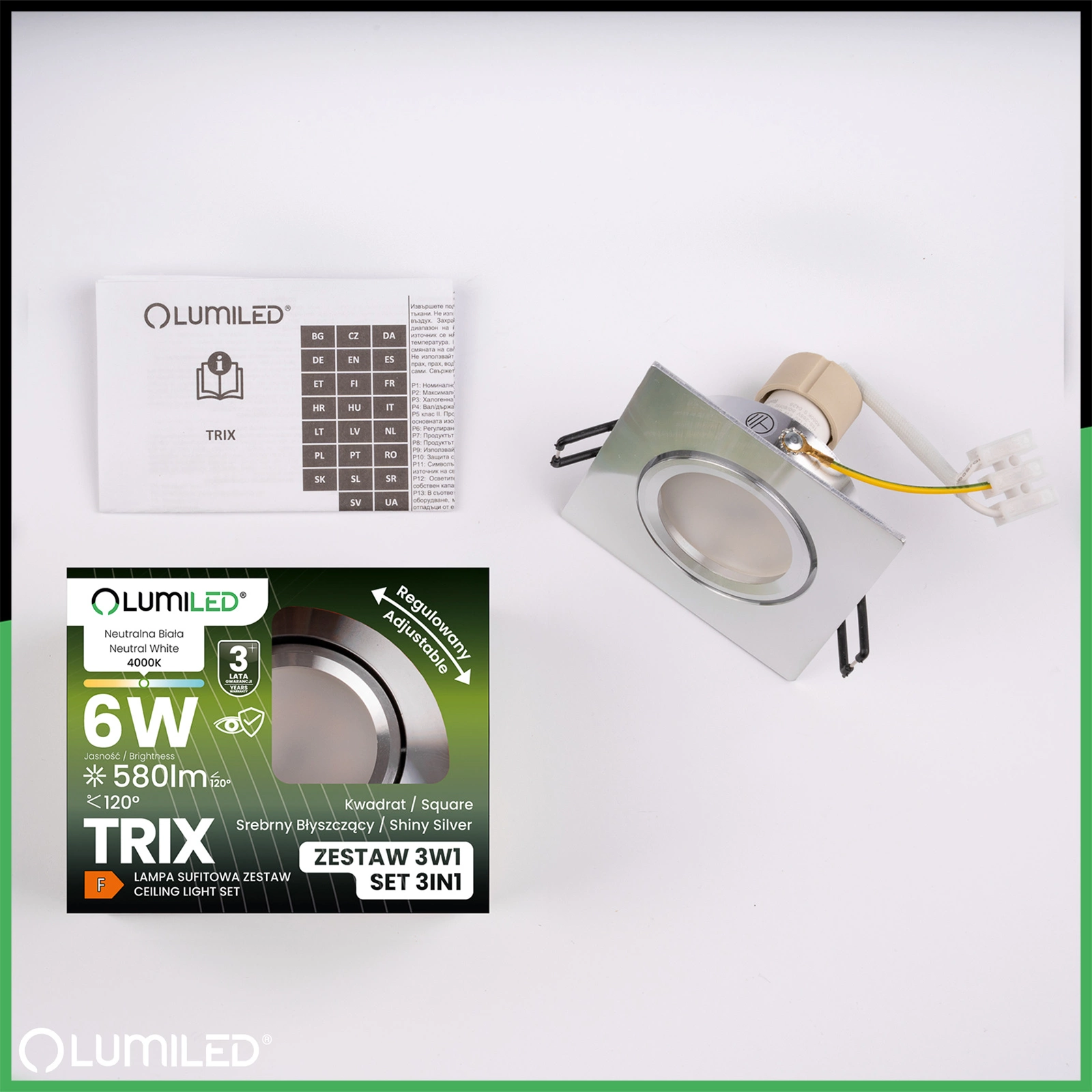 Čtvercové stropní svítidlo Lumiled TRIX v lesklé stříbrné barvě je kompletním řešením 3 v 1 - sada obsahuje zápustnou montáž, 6W LED žárovku GU10 a montážní blok. Neutrální barva světla 4000 K poskytuje přirozené a příjemné osvětlení pro soustředění a každodenní činnosti, zatímco nastavitelný držák umožňuje nasměrovat paprsek do požadovaných oblastí. Jedná se o všestranné osvětlení, které spojuje funkčnost a estetiku v jediném výrobku.