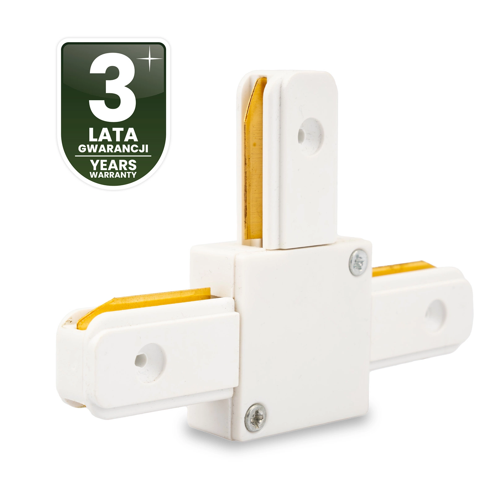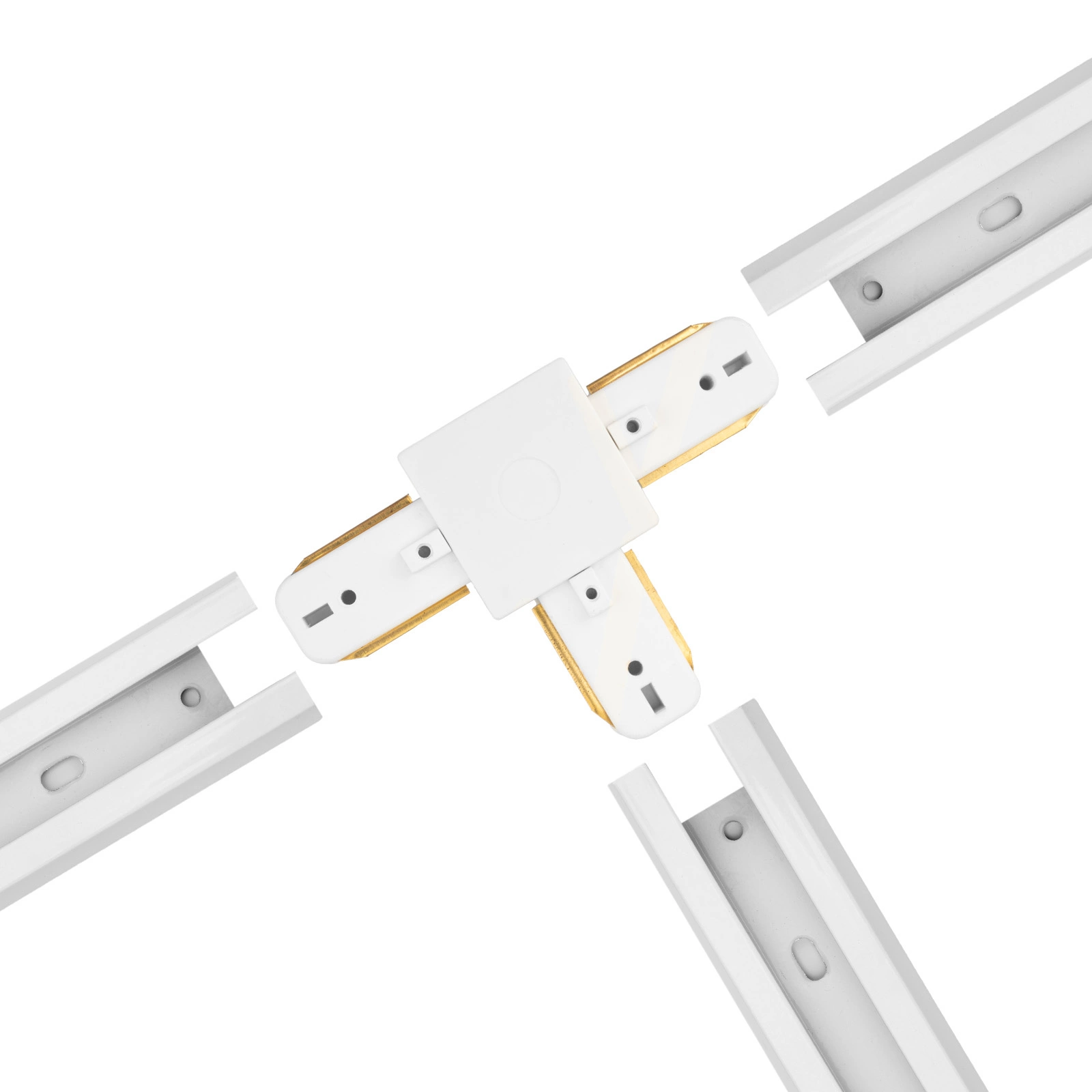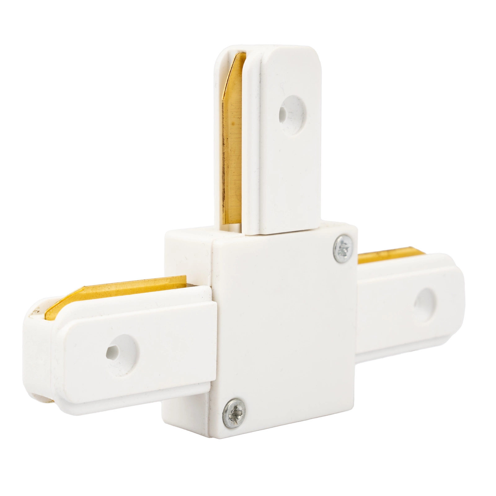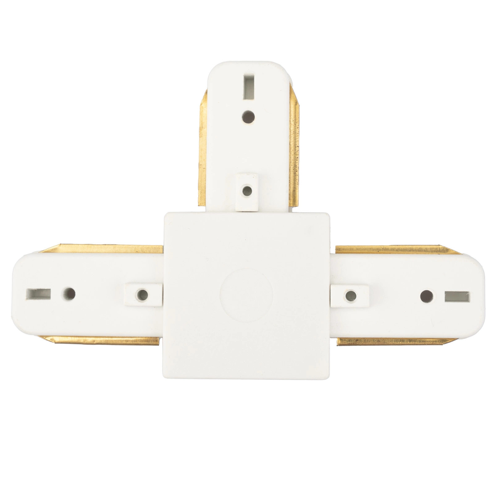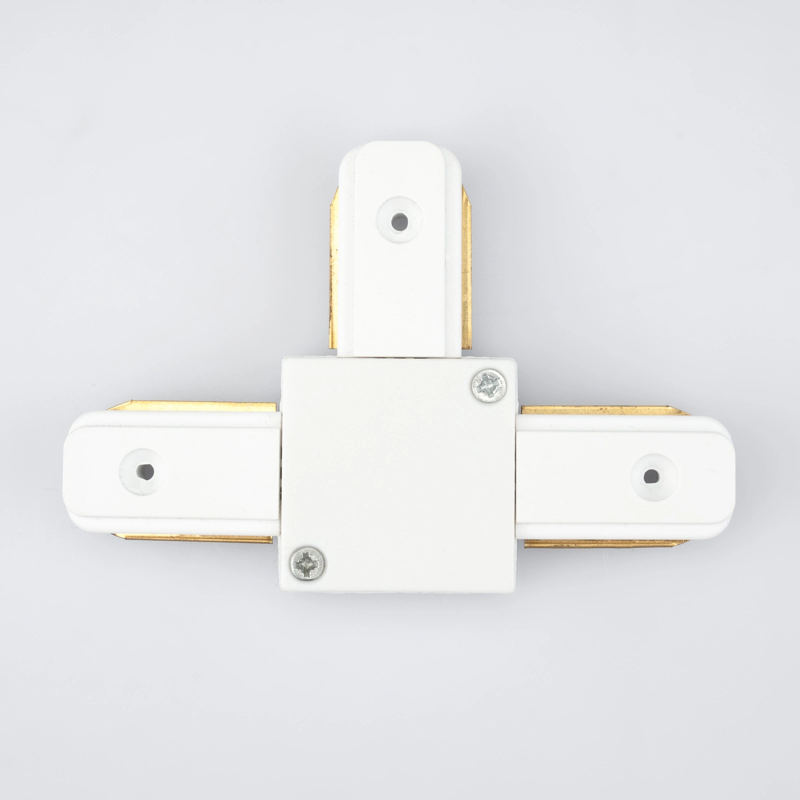 Trojitý konektor v bílé barvě umožňující zapojení přípojnic do série a pod úhlem 90° . Pomocí konektorů můžete prodloužit kolejnice pro kolejové svítilny.