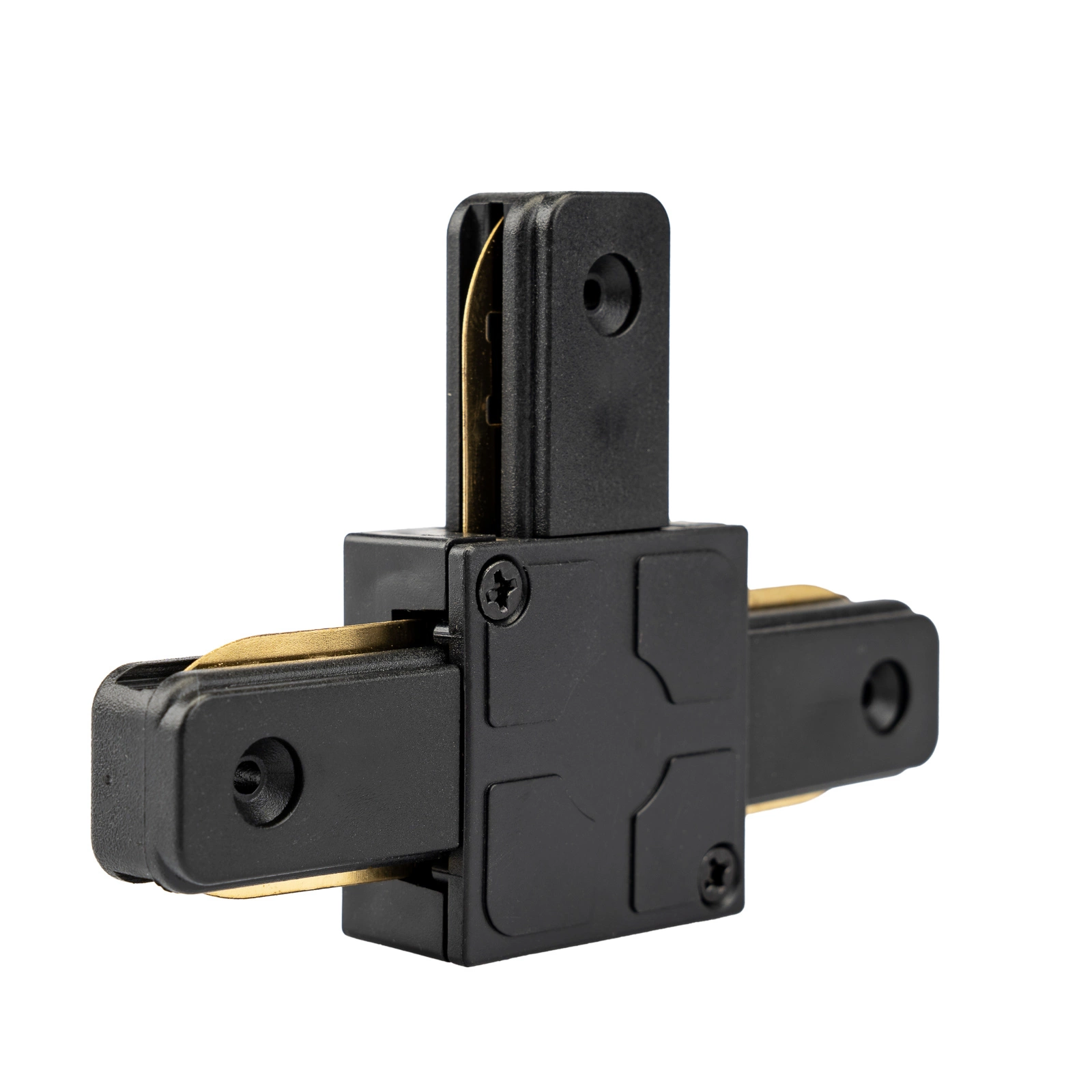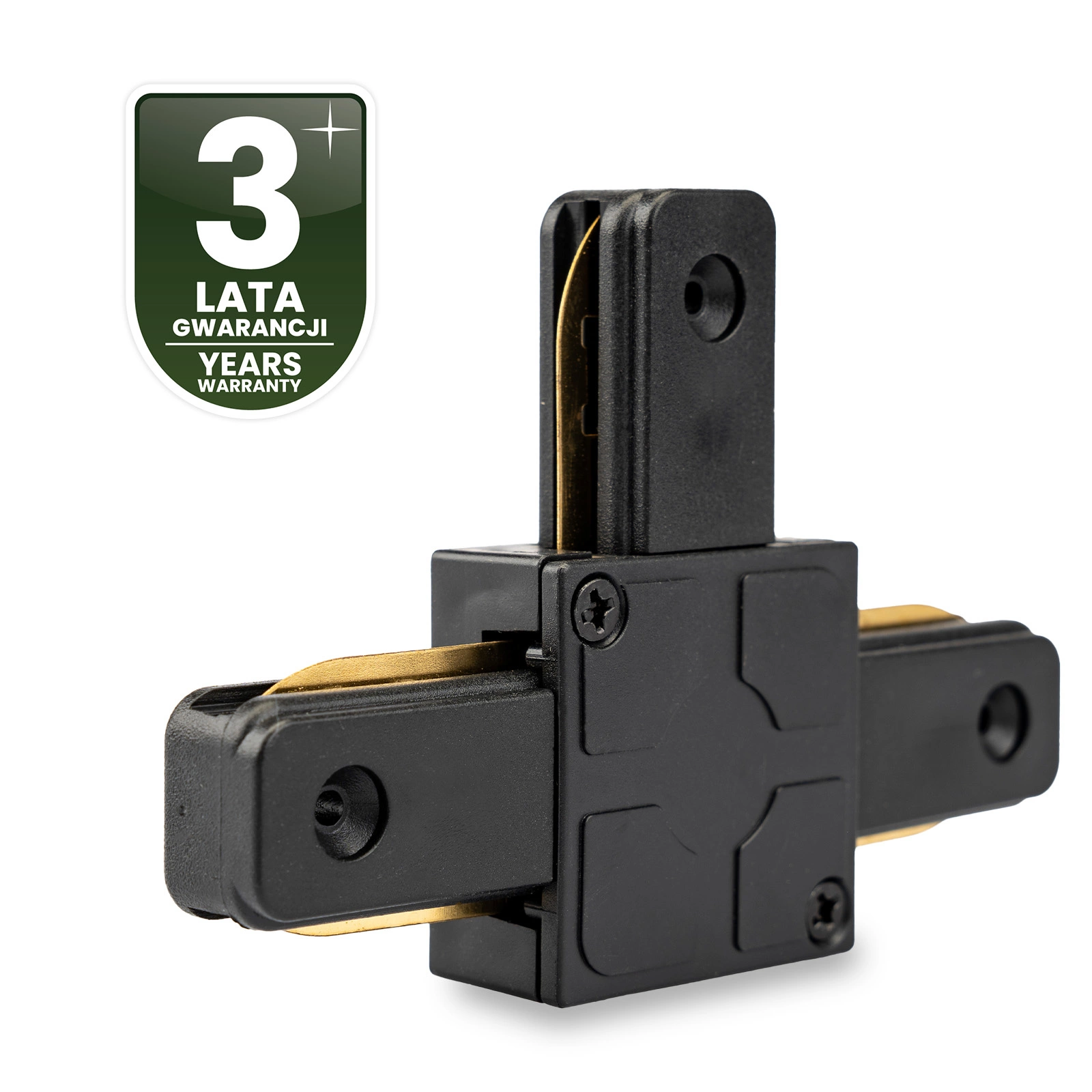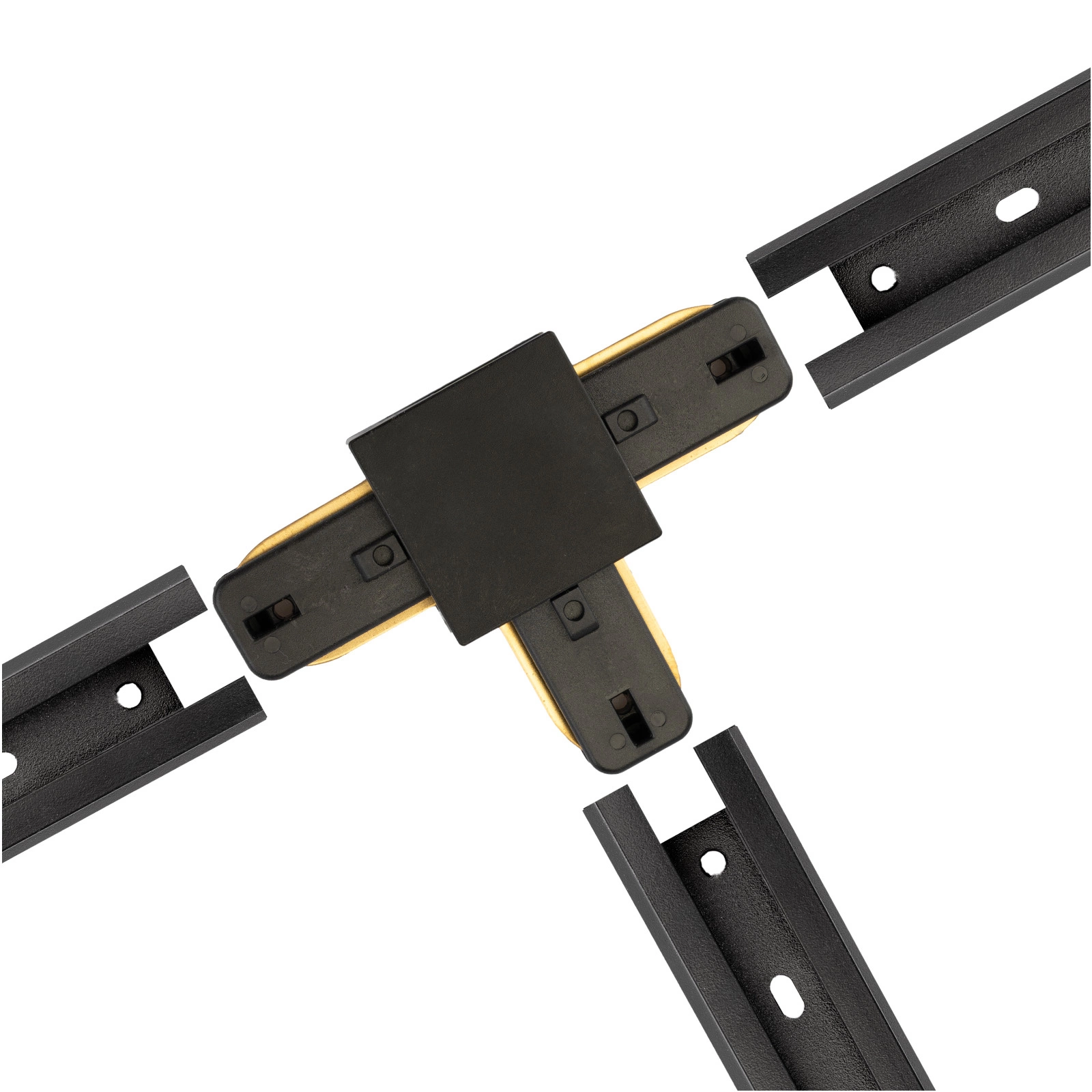 Trojitý konektor v černé barvě umožňující připojení přípojnic do série a pod úhlem 90° . Pomocí konektorů můžete prodloužit kolejnice pro kolejové svítilny.