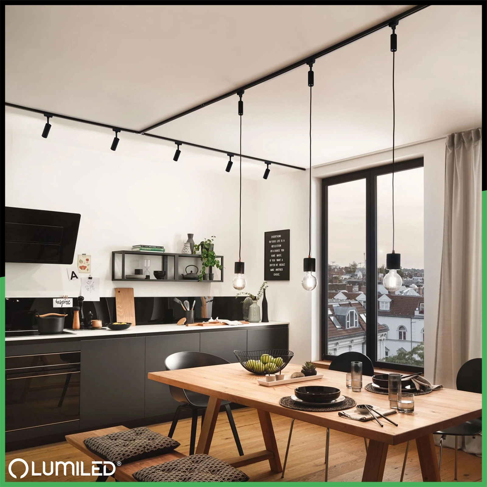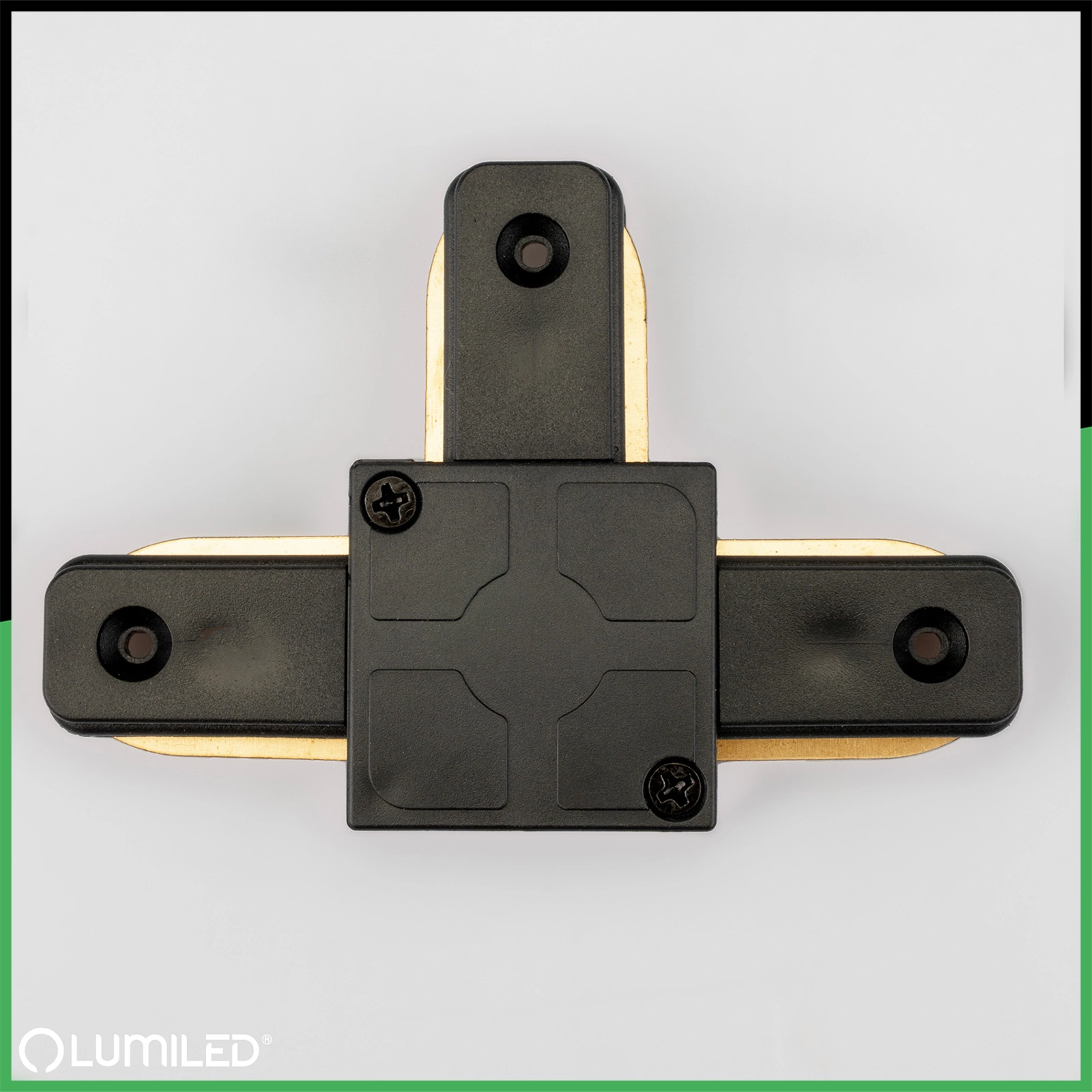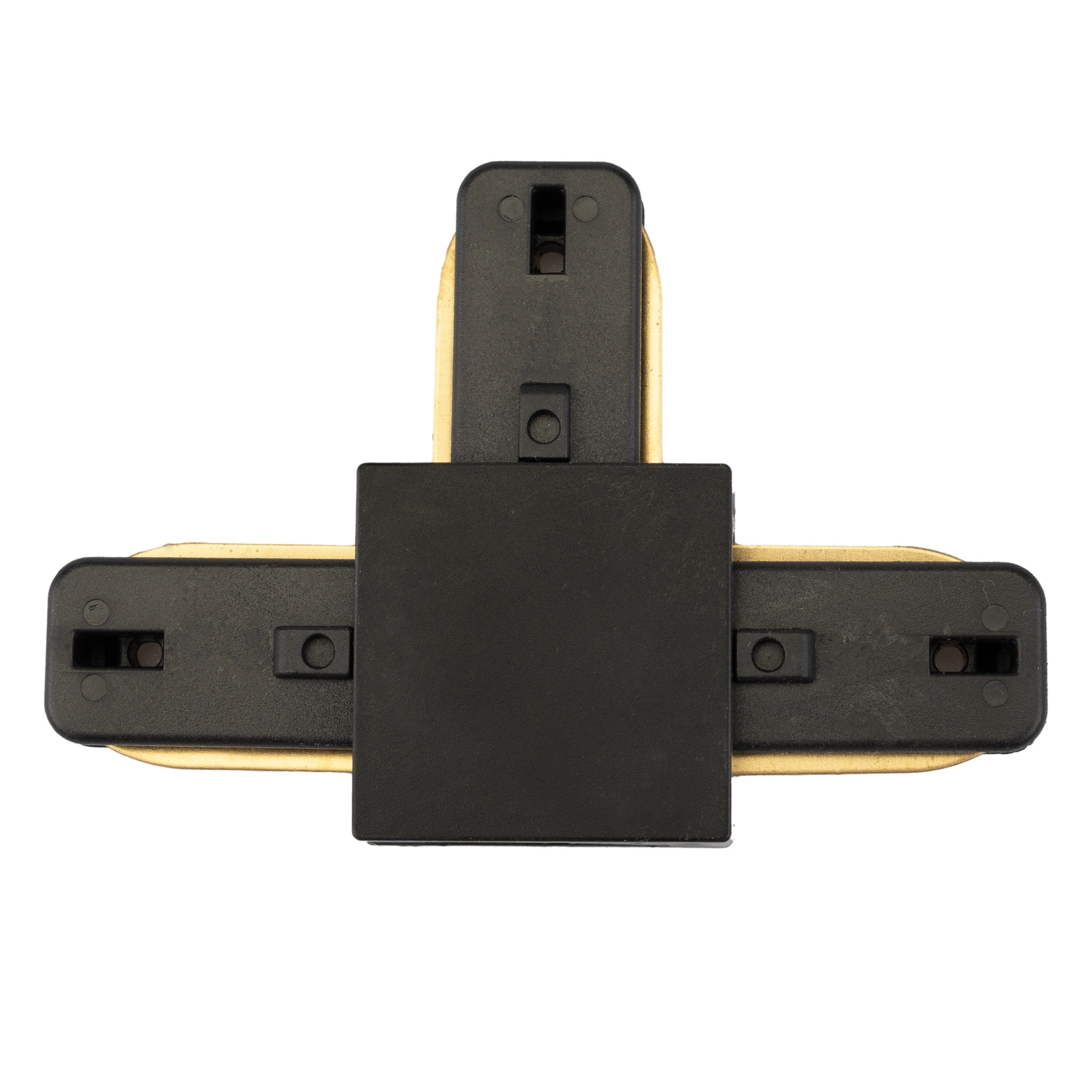 Trojitý konektor v černé barvě umožňující připojení přípojnic do série a pod úhlem 90° . Pomocí konektorů můžete prodloužit kolejnice pro kolejové svítilny.