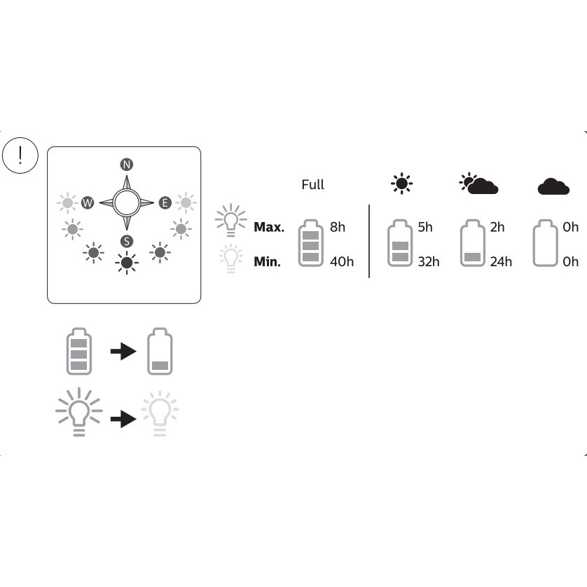 - 8 hodin plného světla při plném nabití za slunečného dne