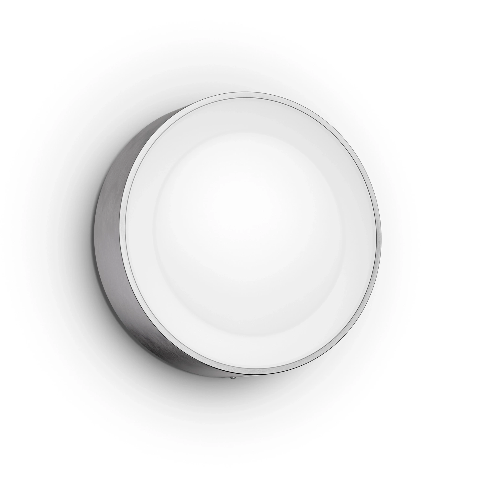 Prezentováno na kruhové nástěnné svítidlo Daylo na adrese stříbro šíří světelný kruh z fasády budovy, který září barevným světlem v jedné z 16 milionů barev. Tento venkovní lampa umožňuje získat měkké, světelné efekty směrované ven a jemné podsvícení za svítidlem.
