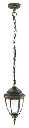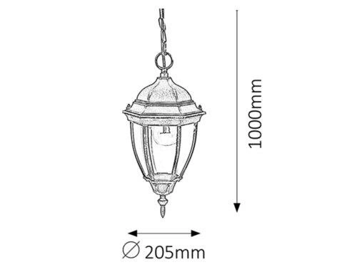 Závěsné svítidlo TORONTO je zajímavé venkovní svítidlo s prostorem pro jeden světelný zdroj E27 max. 60W , který bude perfektním doplňkem k vnějšímu osvětlení vašeho domova. Lampa je vyrobena z vysoce kvalitních materiálů: kov a sklo . Stupeň krytí je IP44 , který zajišťuje těsnost proti vniknutí předmětů o maximálním průměru 1 mm a proti stříkající vodě z libovolného směru. Transparentní stínidlo zakrývající žárovku dokonale rozloží světlo v nejbližším okolí a samotný převis bude nejlépe vypadat v altánku, zimní zahradě (zimní zahradě) nebo na terase. Lampa TORONTO bude jistě skvělým doplňkem vaší zahrady.