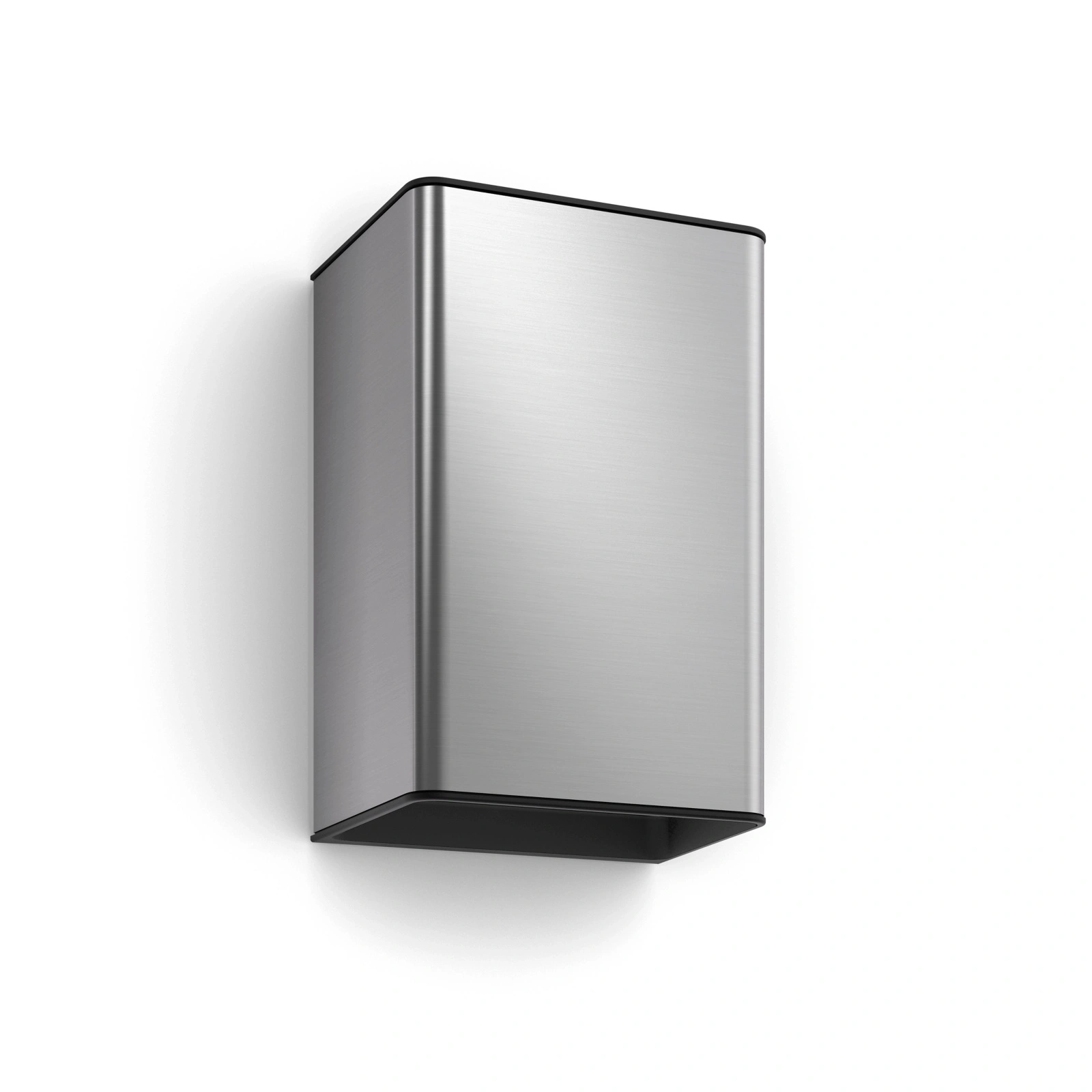 Prezentováno na nástěnné svítidlo Resonate na adrese ocel usměrňuje světlo nahoru a dolů, tvořící světelné trojúhelníky na fasádě budovy. Umožňuje efektivní osvětlení verandy nebo terasy elegantním barevným světlem.