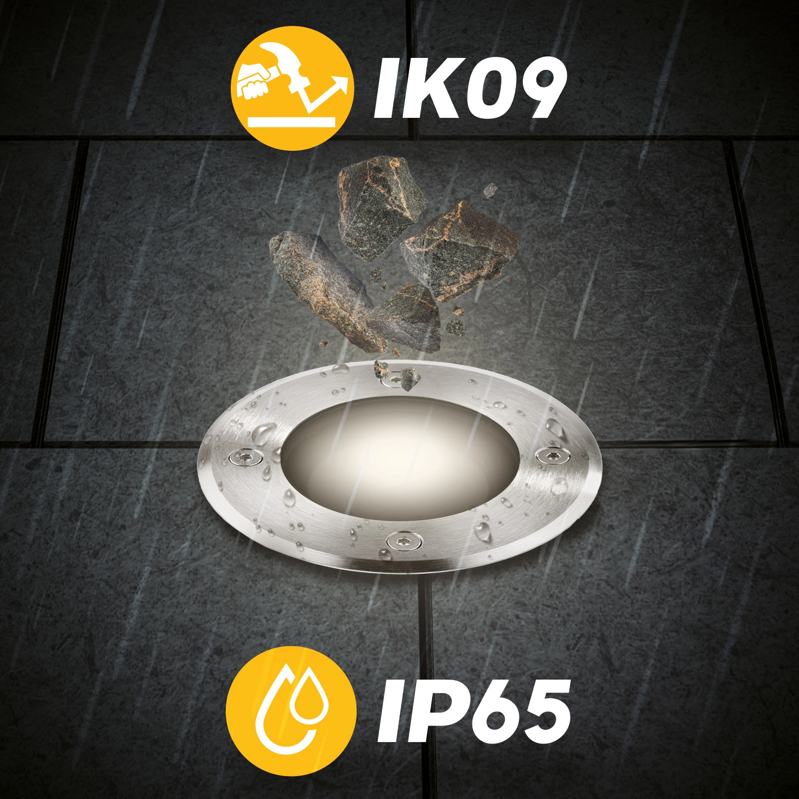 Vysoce kvalitní materiály použité při výrobě a dobrá shoda dílů zajišťují, že svítidlo má vysokou odolnost proti mechanickému poškození IK09 a odolnost proti nepříznivým povětrnostním podmínkám IP65 - vydatný déšť, kroupy nebo sníh.
