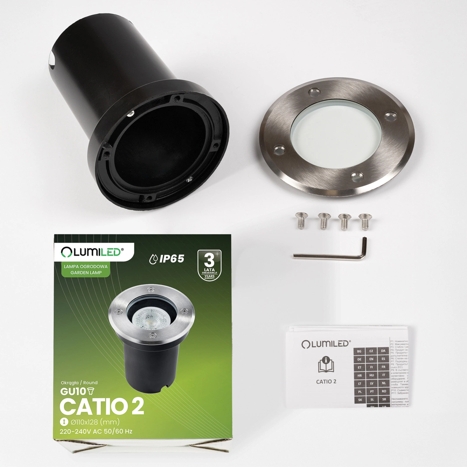 Vestavné svítidlo série CATIO 2 renomované a uznávané značky v osvětlovací branži Lumiled s paticí GU10. Toto svítidlo se skvěle hodí pro osvětlení teras, zahradních cest, příjezdových cest, parkovišť a keřů. Svítidlo je vyrobeno z materiálů nejvyšší kvality. Kryt lampy je vyroben z vysoce kvalitní nerezové oceli, která je odolná proti korozi, a skla z tvrzeného skla, které má vysoký práh odolnosti vůči tlaku vysoké tonáže. Svítidlo je vybaveno keramickou montážní paticí pro světelný zdroj s paticí GU10.