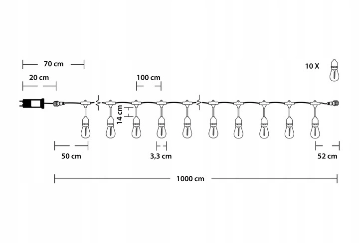 - Vzdálenost od zdroje napájení k první žárovce je 70 cm