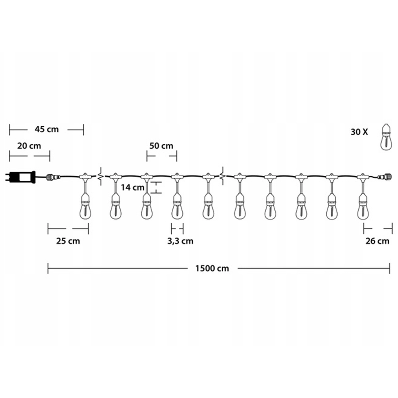 Venkovní řetěz 15m, 30x E27 Žárovky 1.3W 2200K MALUS LUMILED