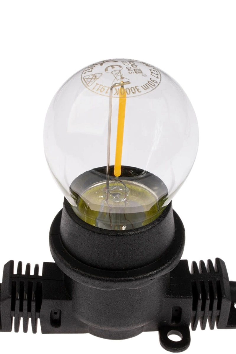 Venkovní dekorativní girlanda od renomované značky KOBI je ozdobný provázek s deseti dekorativními LED žárovkami v podobě malé průhledné kuličky se závitem E27 a výkonem 1,3 W. Tvoří kompletní a odolný zdroj světla.