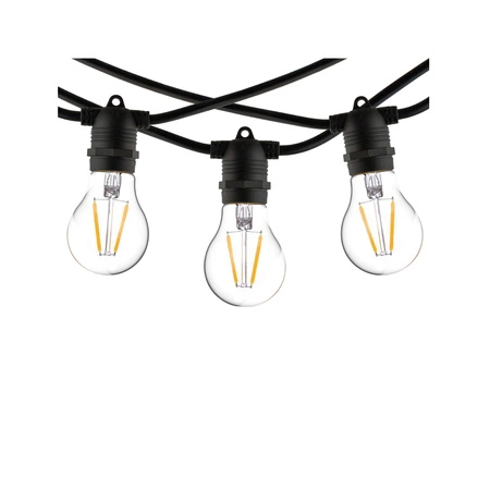 Girlanda FESTOON LIGHTS byla vyrobena společností Nowodvorski, renomovanou a uznávanou společností v oboru osvětlení . Je vybaveno celkem 15 světelnými body o výkonu 15W (vyměnitelné). Každý z nich je vybaven paticí se závitem E27 , která má vysoký stupeň krytí IP65 a je voděodolná. Girlanda je vyrobena z kvalitního černého plastu a její délka je 9 m . Tento model má také zásuvku, která umožňuje připojení další girlandy. Celková maximální délka, které lze dosáhnout, je 80m s celkovým výkonem 2000W.