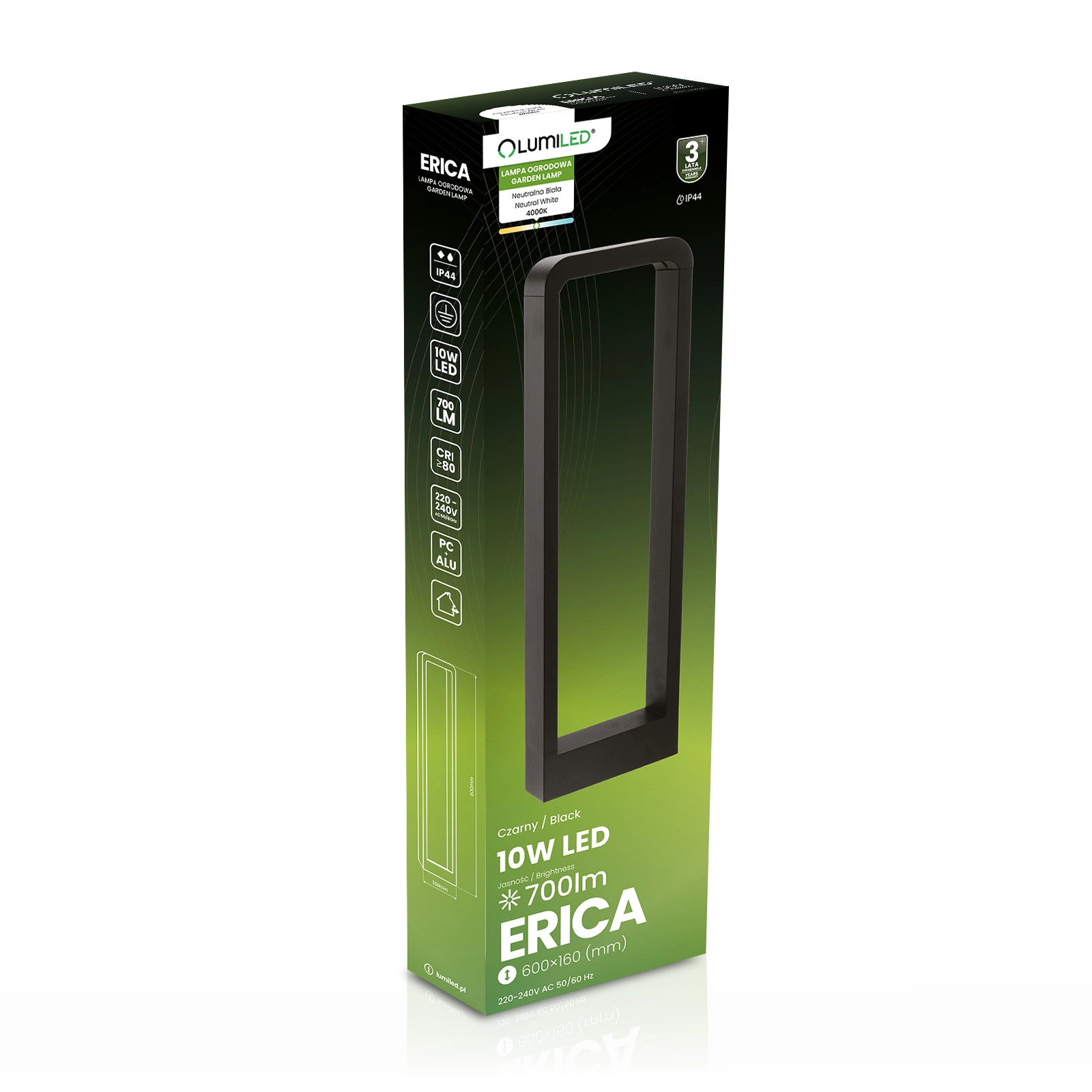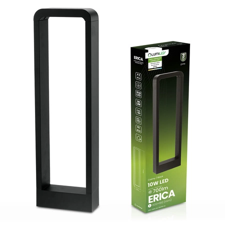 Zahradní LED svítidlo řady ERICA od LUMILED se vyznačuje především minimalistickým vzhledem a bezproblémovou instalací. Svítidlo má ve svítidle integrovaný moderní 10W LED světelný zdroj , který generuje světelný tok až 700lm. LED lampa vydává neutrální a příjemnou barvu světla s barevnou teplotou. Díky jednoduchému designu se lampa hodí téměř do každé zahrady. Svítidlo ERICA bylo vyrobeno s velkým důrazem na detail z kombinace vysoce kvalitního hliníku a plastu (polykarbonátu). Mléčný prvek lampy v kombinaci s černým pouzdrem dělá lampu velmi stylovou, i když je světlo vypnuté.
