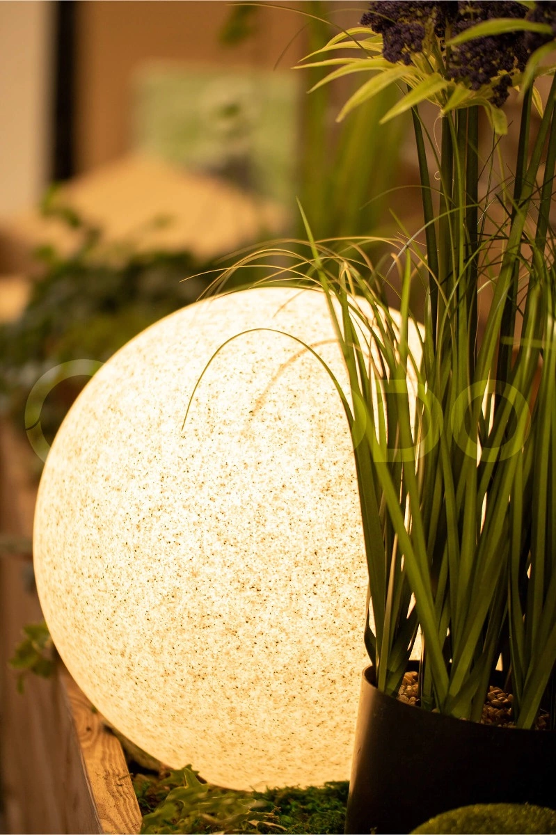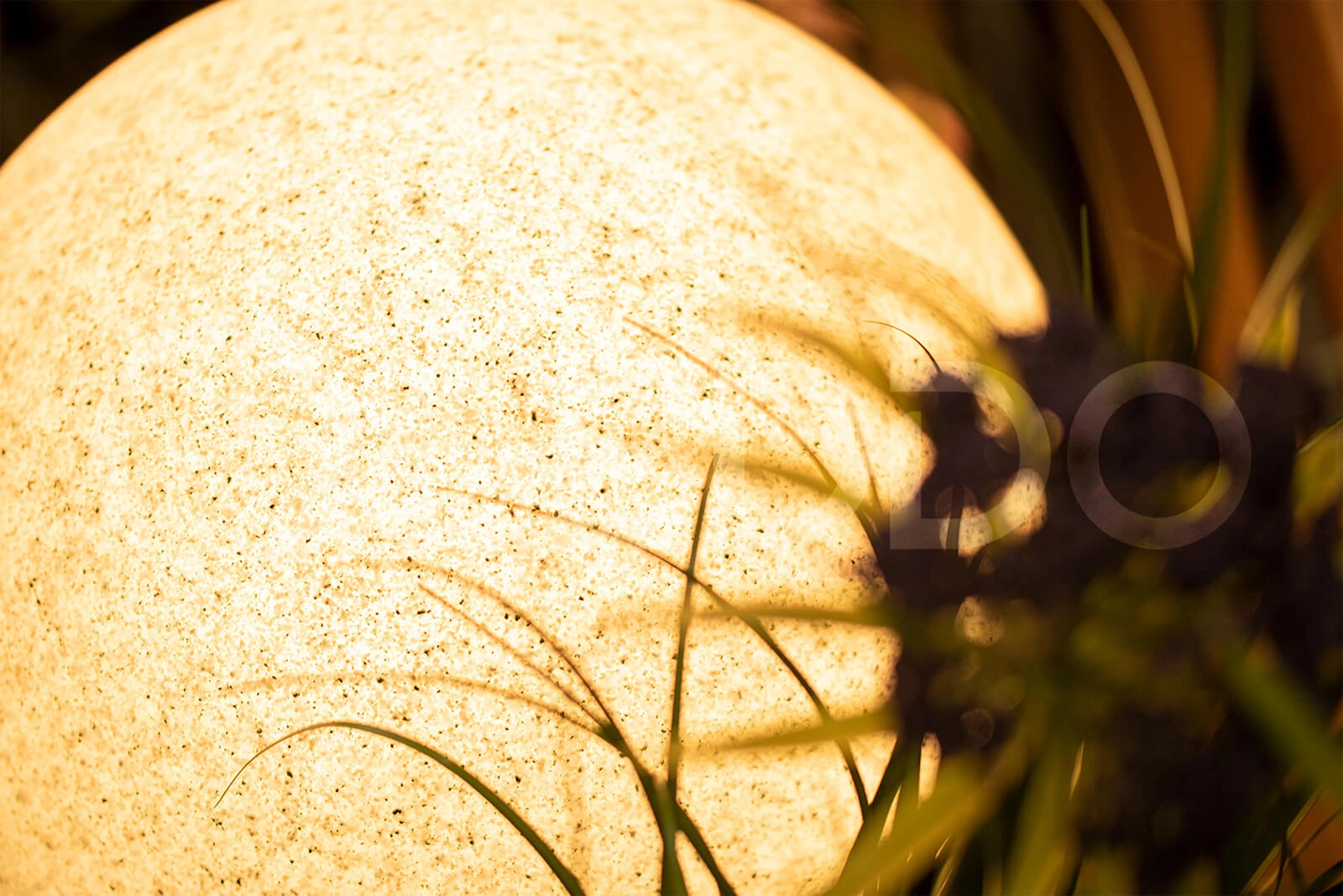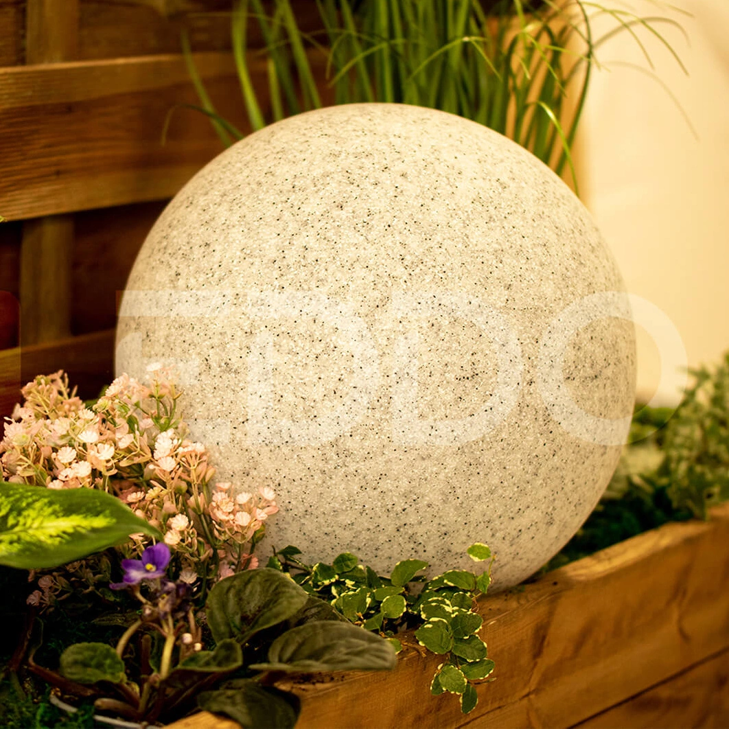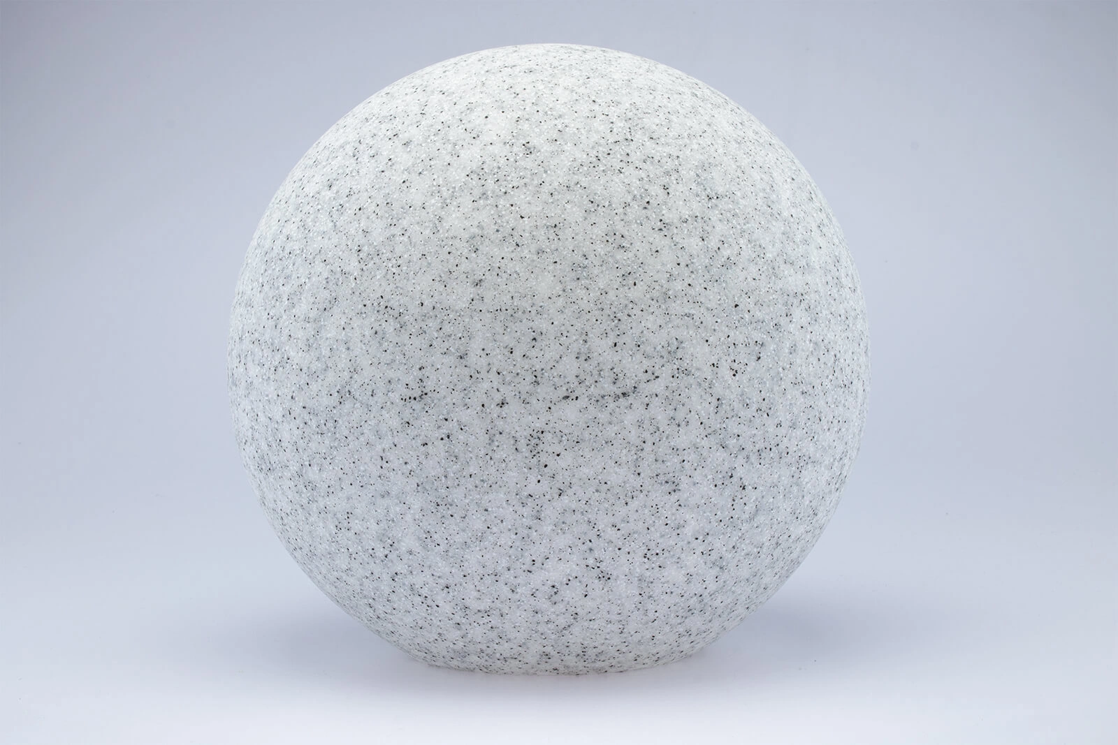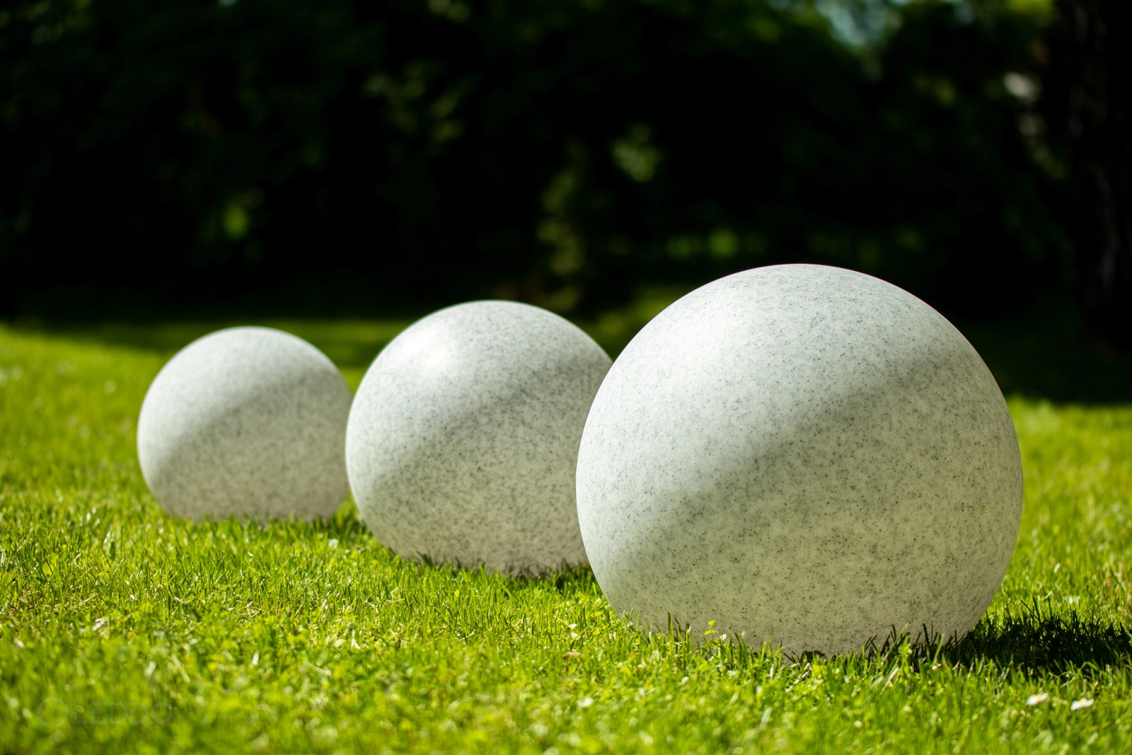 Zahradní koule je venkovní osvětlení o průměru 30 cm, v barvě imitace kamene , vyrobené z kvalitního plastu (polyetylenu), takže toto svítidlo lze instalovat na místa přímo vystavená povětrnostním vlivům.
