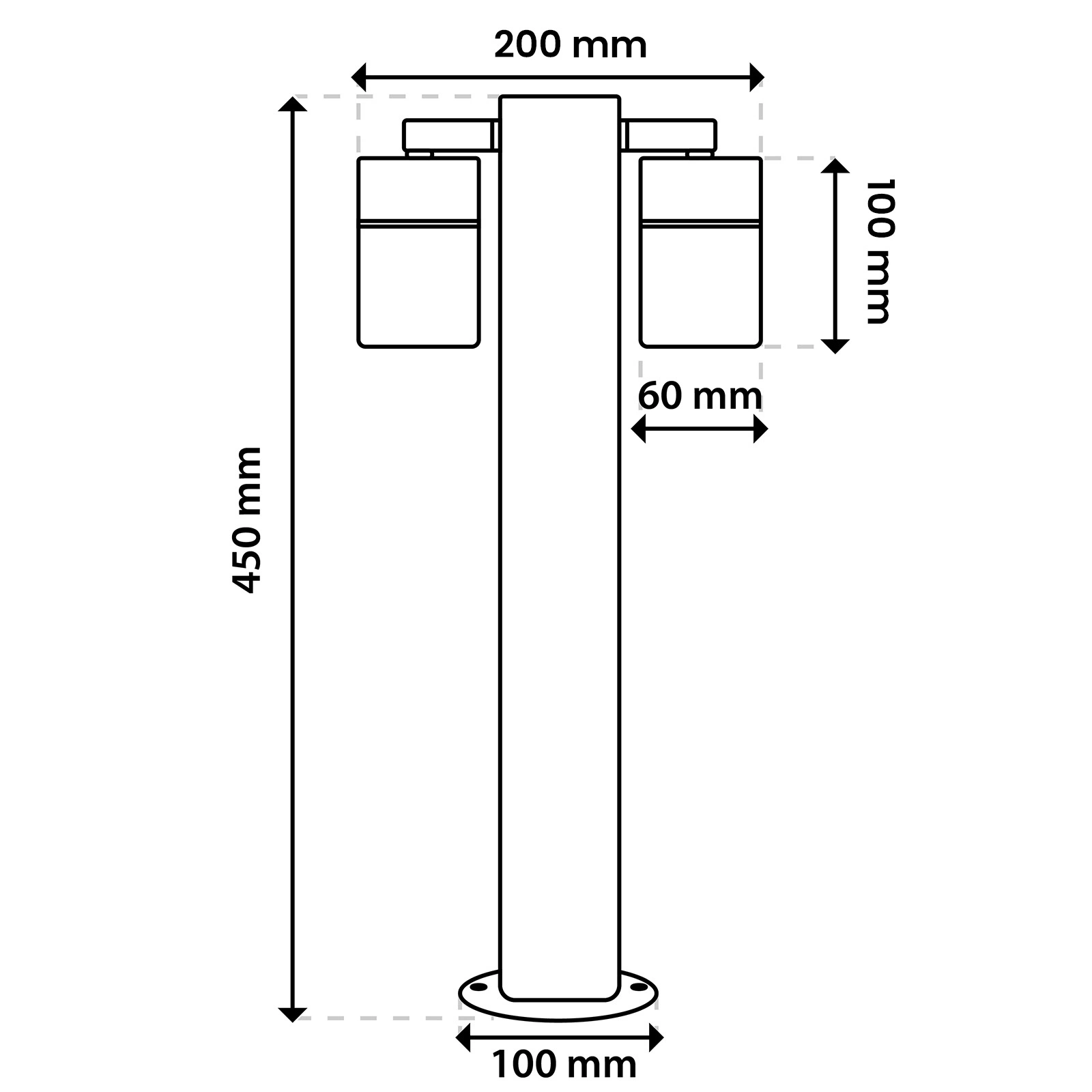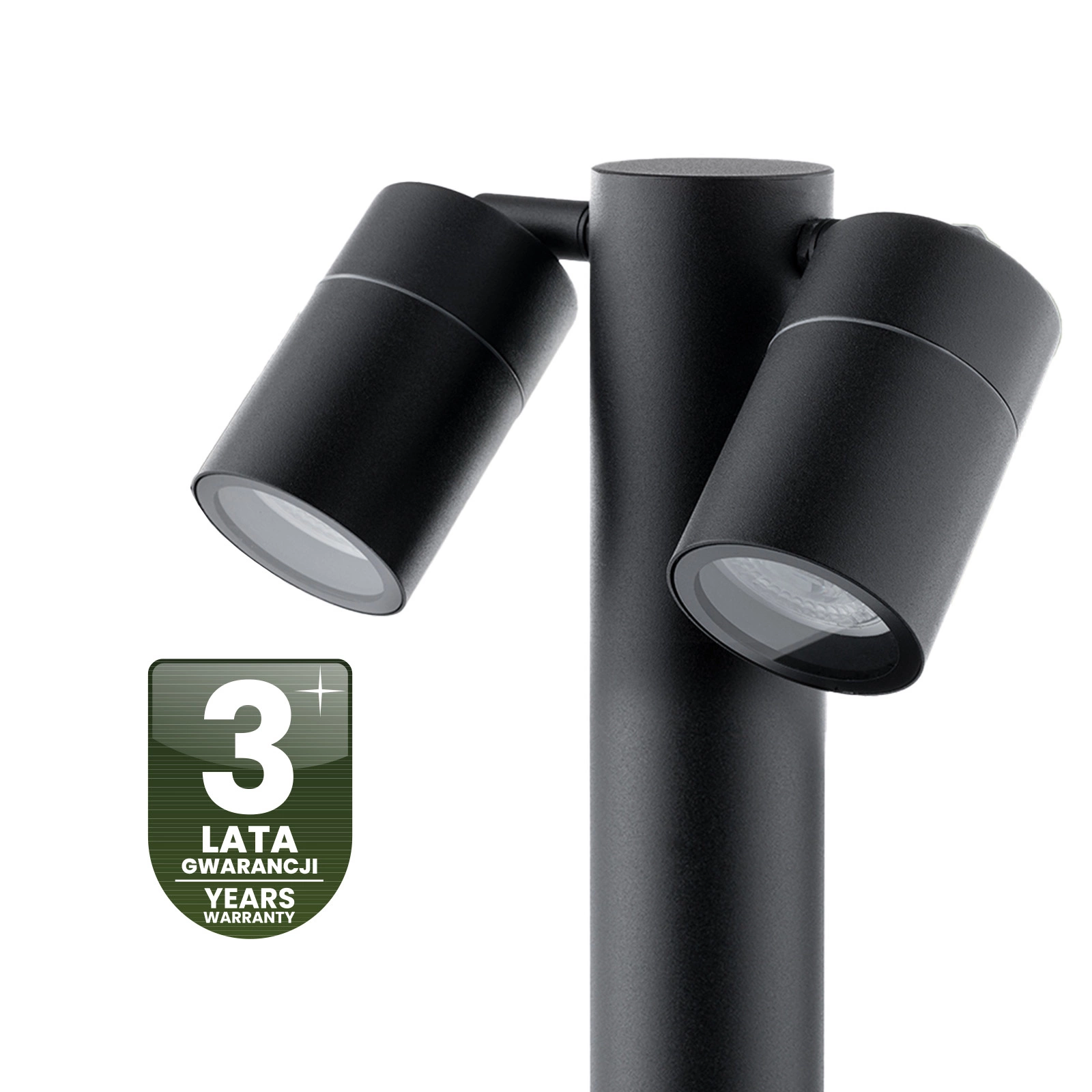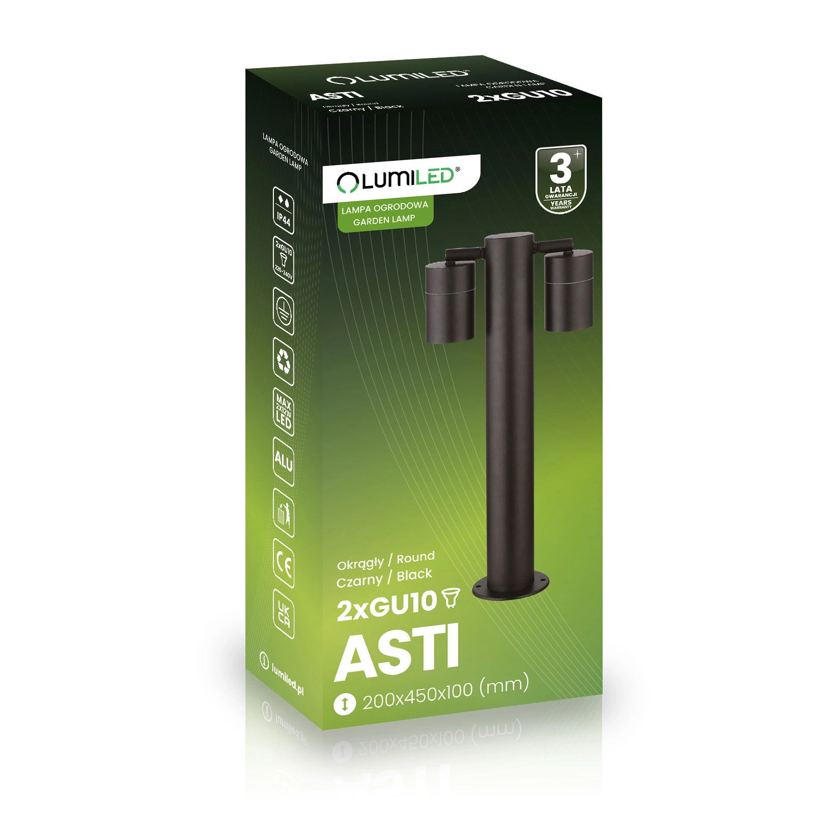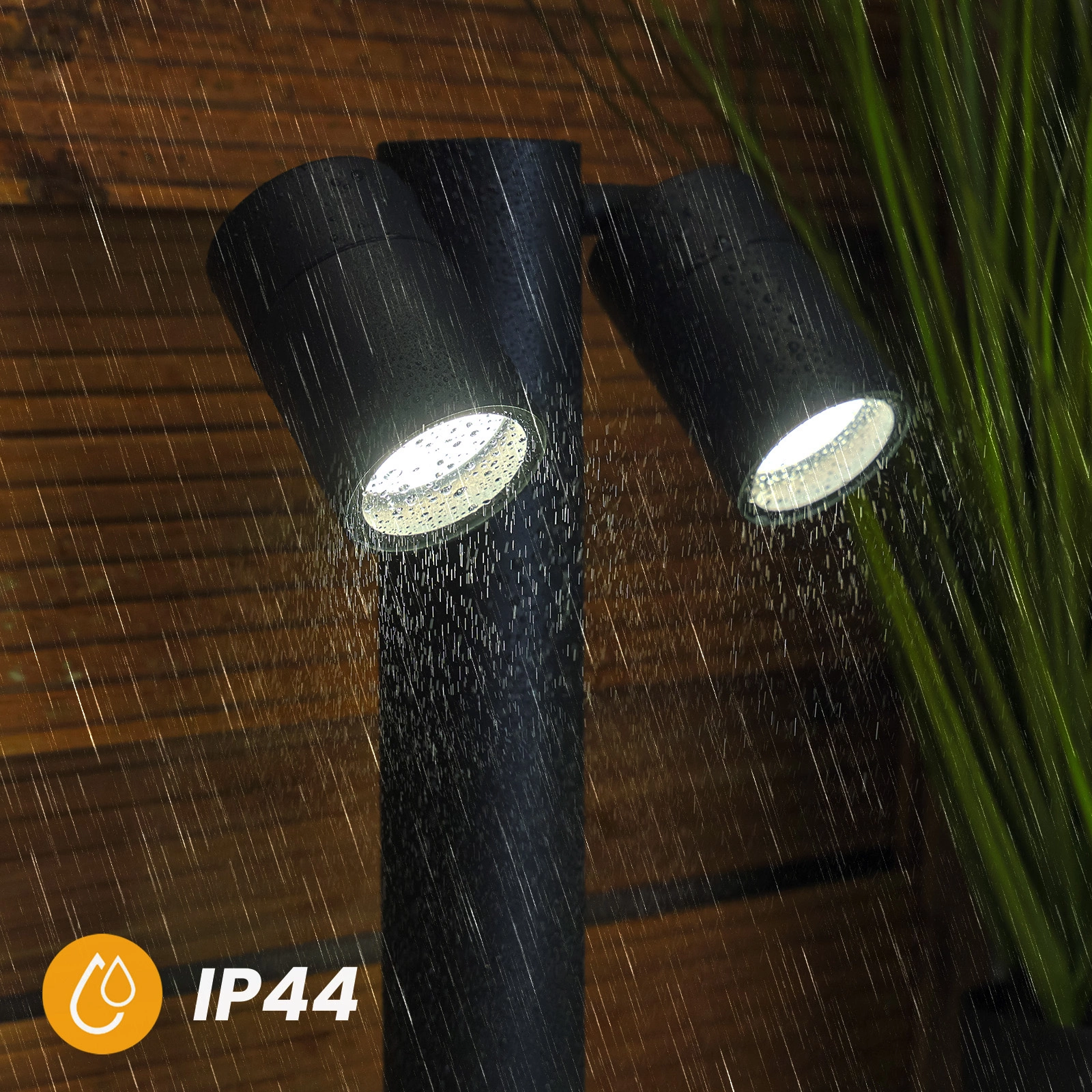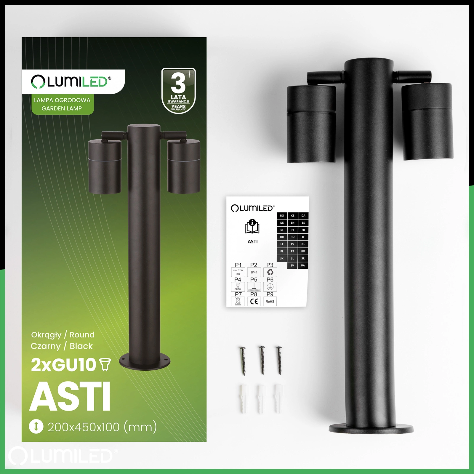 Stojací lampa 45 cm ze série Asti je nejnovější venkovní zahradní svítidlo vyrobené z nejkvalitnější oceli, které zajišťuje odolnost výrobku na velmi vysoké úrovni. Prezentovaná zahradní lampa se dvěma bodovými stínidly je nejlepší volbou pro osvětlení zahradních cest, příjezdových cest a chodníků. Místa, kde bude instalován, získají díky svému modernímu designu jedinečné kouzlo a zajímavější vzhled. Použité materiály zaručují krytí IP44 , které poskytuje svítidlu ochranu proti stříkající vodě a předmětům silnějším než 1 mm. Vnější svítidlo je vybaveno dvojitou paticí s univerzálním závitem GU10 , kde doporučujeme použít úsporné LED žárovky.