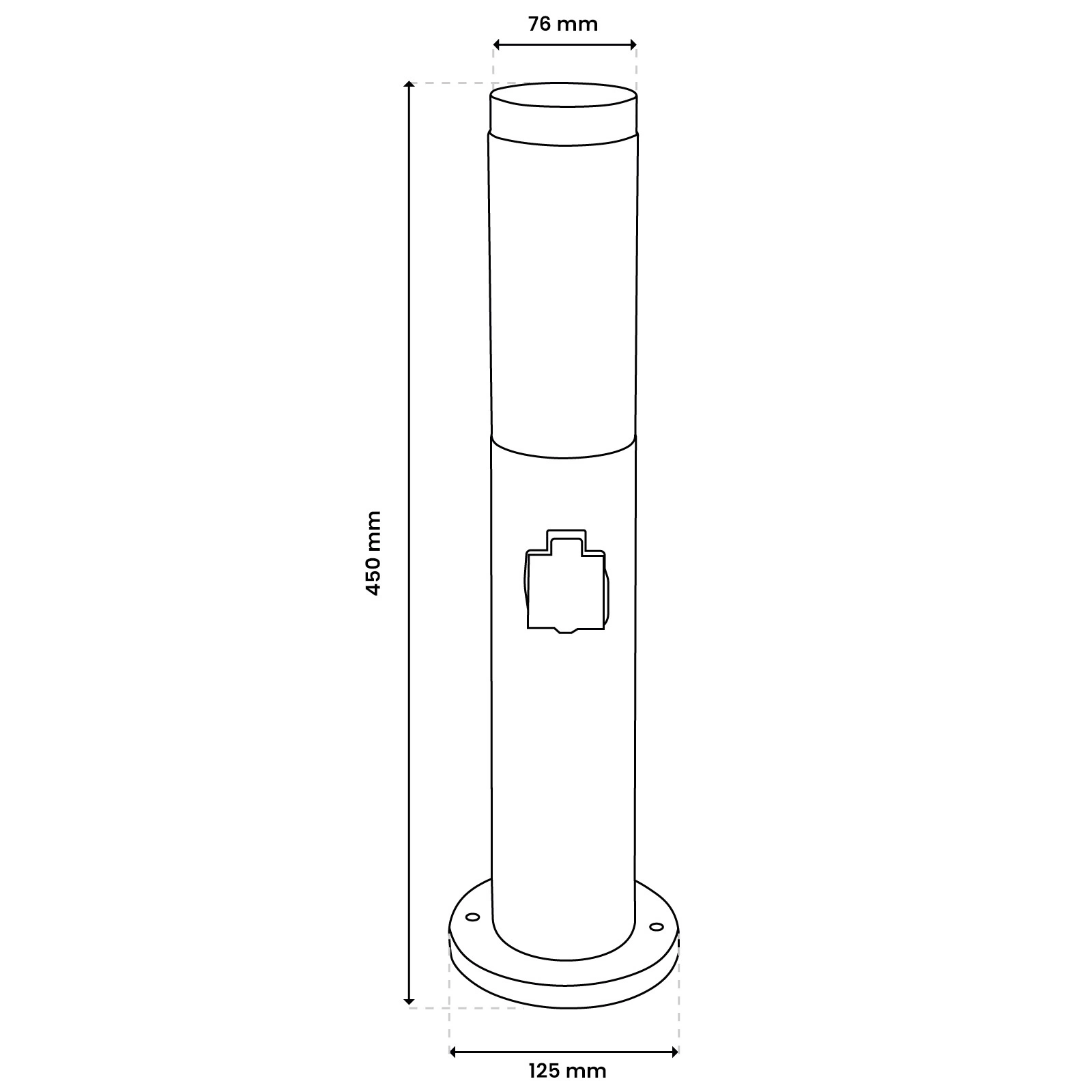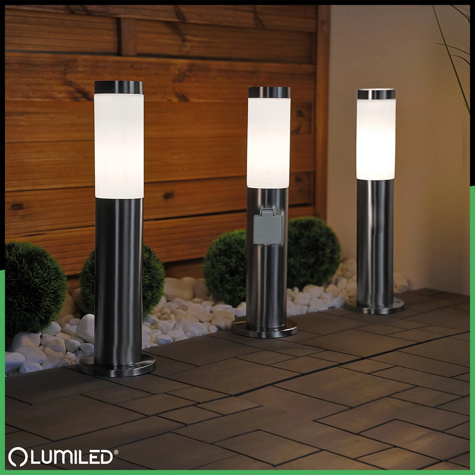 Venkovní zahradní lampa E27, LED se zásuvkou sloupek 230V 45cm inox LILIUM LUMILED