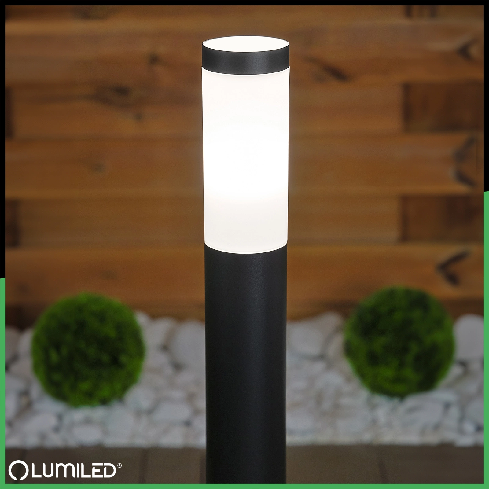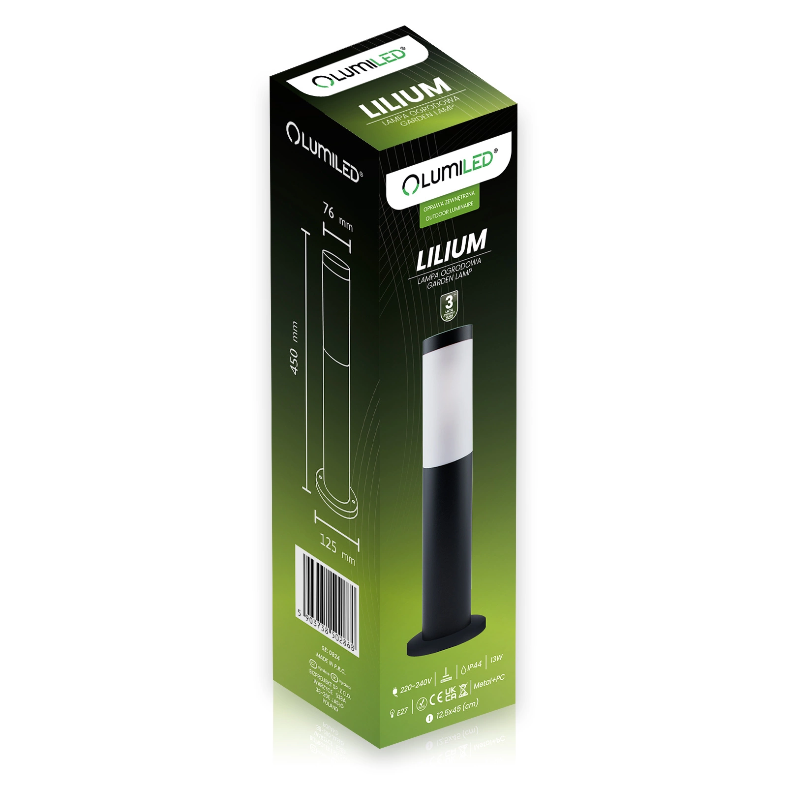 Zahradní nástěnná lampa, venkovní sloupek o výšce 45 cm v černé barvě ze série LILIUM značky LUMILED. Lampa je vyrobena z vysoce kvalitní nerezové oceli a plastu. Použití nerezové oceli při výrobě lampy zajišťuje, že je odolná, snadno se čistí a zároveň je atraktivní na pohled. Lampa byla navržena s ohledem na její uživatele, je vybavena oblíbenou paticí E27 - což umožňuje našroubovat jakoukoli žárovku s tímto závitem a její výkon nepřesahuje 12W v případě LED žárovky.