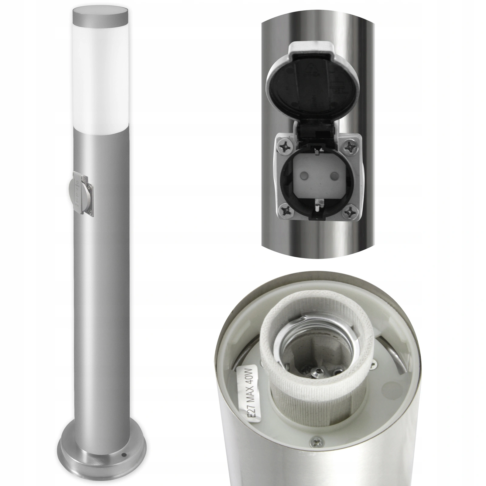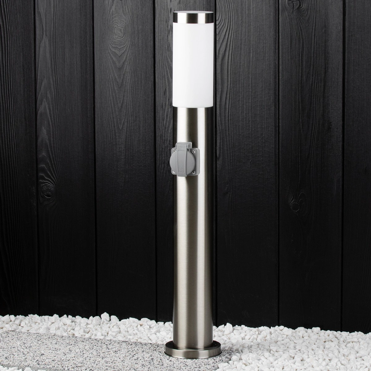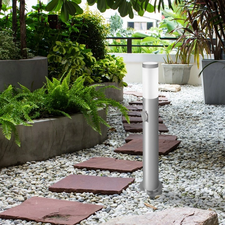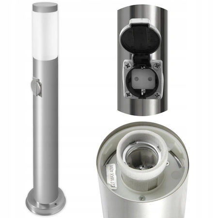 Zahradní lampa, venkovní sloupek, 65 cm vysoká, stříbrná se zabudovanou zásuvkou 230V. Lampa je vyrobena z kvalitní nerezové oceli a plastu. Díky použití nerezové oceli k výrobě lampy je odolná, snadno se čistí a má atraktivní vzhled. Lampa byla vytvořena s ohledem na své uživatele, využívá oblíbenou patici E27 - která umožňuje našroubovat jakoukoliv žárovku s tímto závitem a její výkon nepřesahuje v případě LED žárovky 20W.