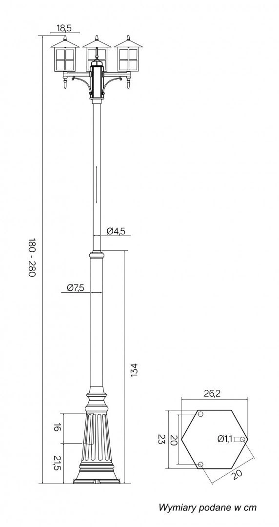 Vysoká pevná lucerna, stožárová lampa ze série WENECJA se třemi stínidly Su-Ma . Díky pečlivému zpracování a použití těch nejkvalitnějších materiálů působí lampa mimořádně elegantně. Instalací na vaší zahradě si můžete být jisti, že i přes vystavení měnícím se povětrnostním podmínkám zůstane plně funkční a bude vypadat perfektně po mnoho let. Světelným zdrojem v prezentovaném zahradním svítidle jsou tři žárovky s paticí E27 (nejsou součástí dodávky) . Vzhledem k nízké spotřebě energie a vysoké světelné účinnosti je nejlepší zvolit LED žárovku . Díky možnosti výměny světelného zdroje můžeme výkon a barvu světelného zdroje přizpůsobit našim potřebám a preferencím.