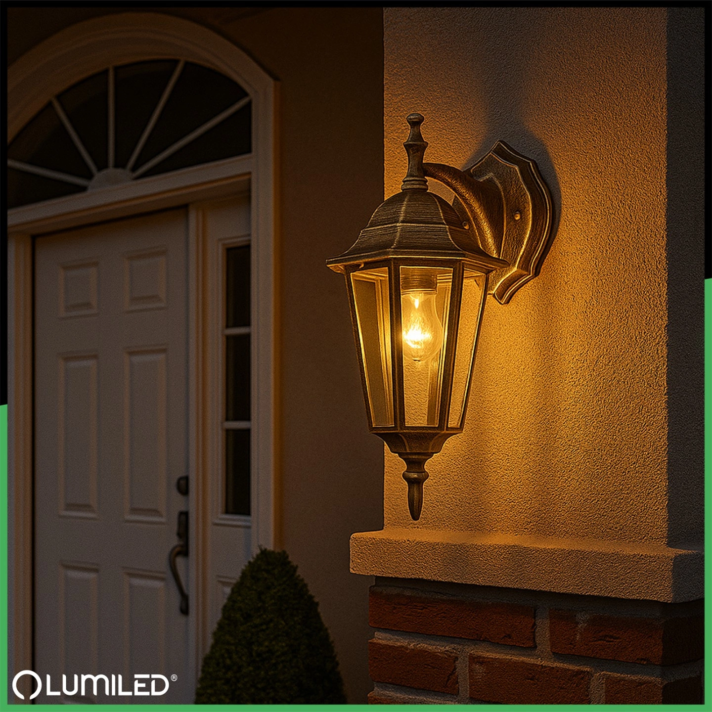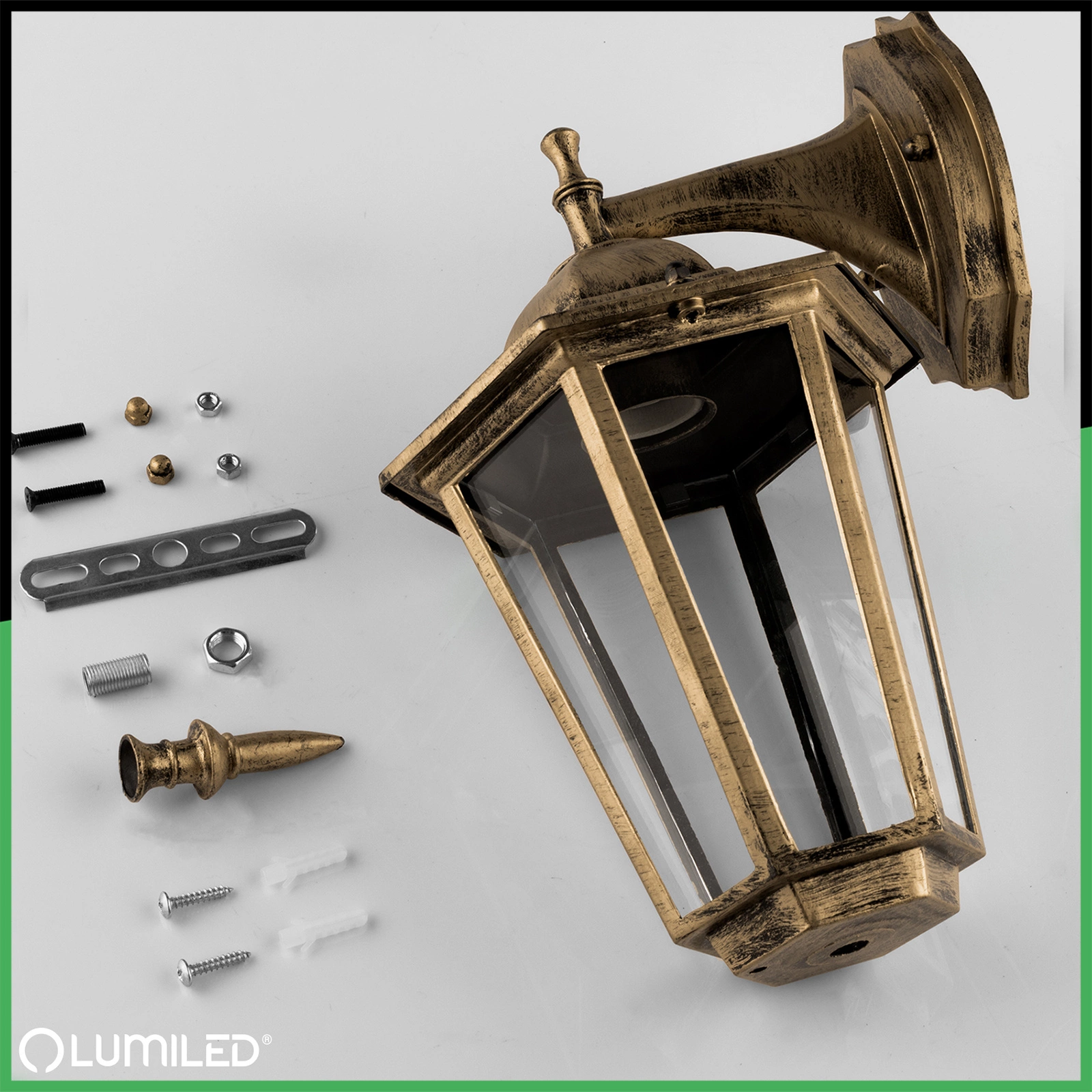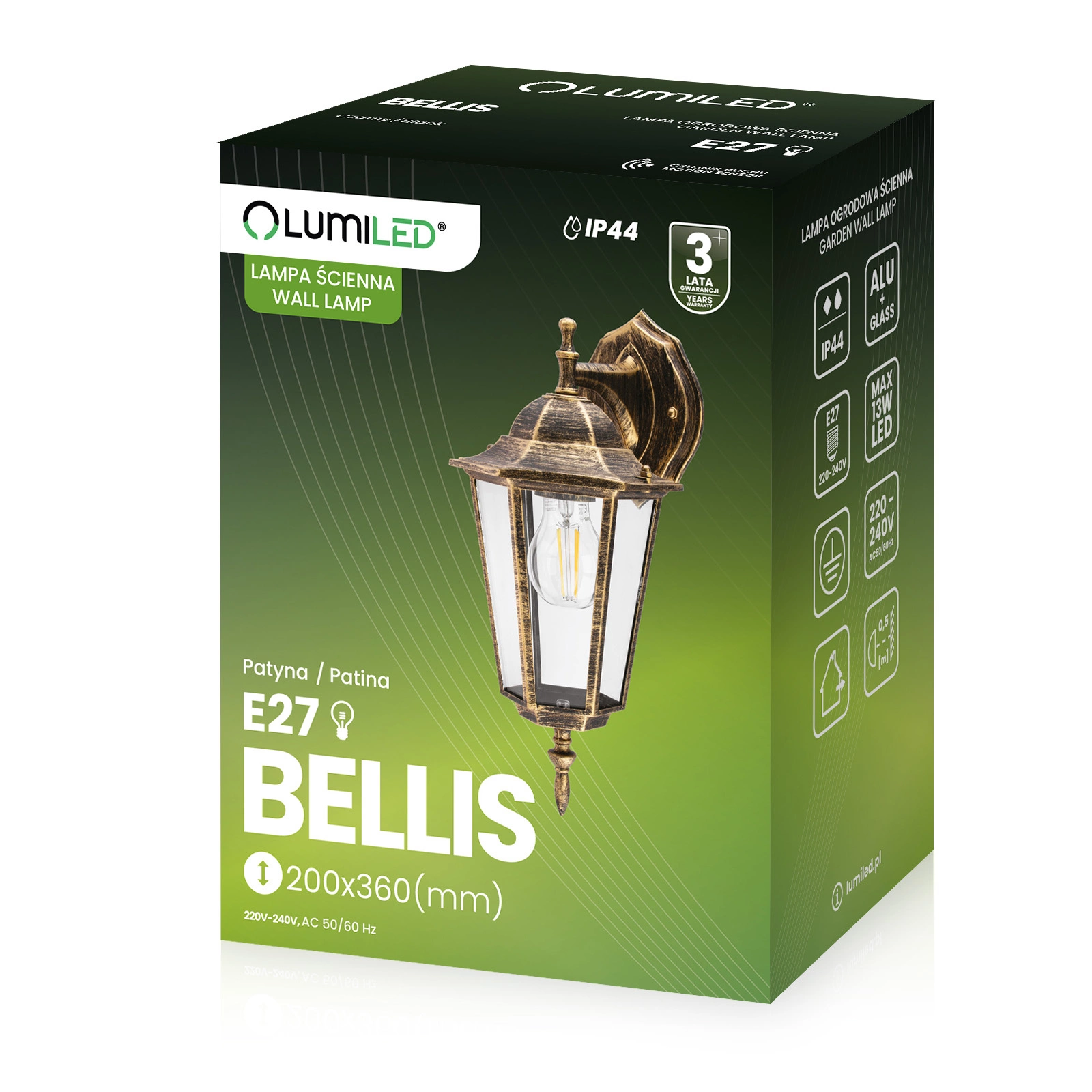 Nástěnná zahradní lampa značky LUMILED série BELLIS v barvě patiny (staré zlato) se vyznačuje především krásným vzhledem ve tvaru lucerny a snadnou montáží. Toto elegantní a praktické osvětlení je ideální pro venkovní použití kolem domu. Je určena pro montáž na povrch fasád budov. Zahradní lampa usnadní pohyb po pozemku večer, nejenže jej osvětluje, ale také dodává magickou atmosféru, aby ještě více zpříjemnila čas strávený venku.