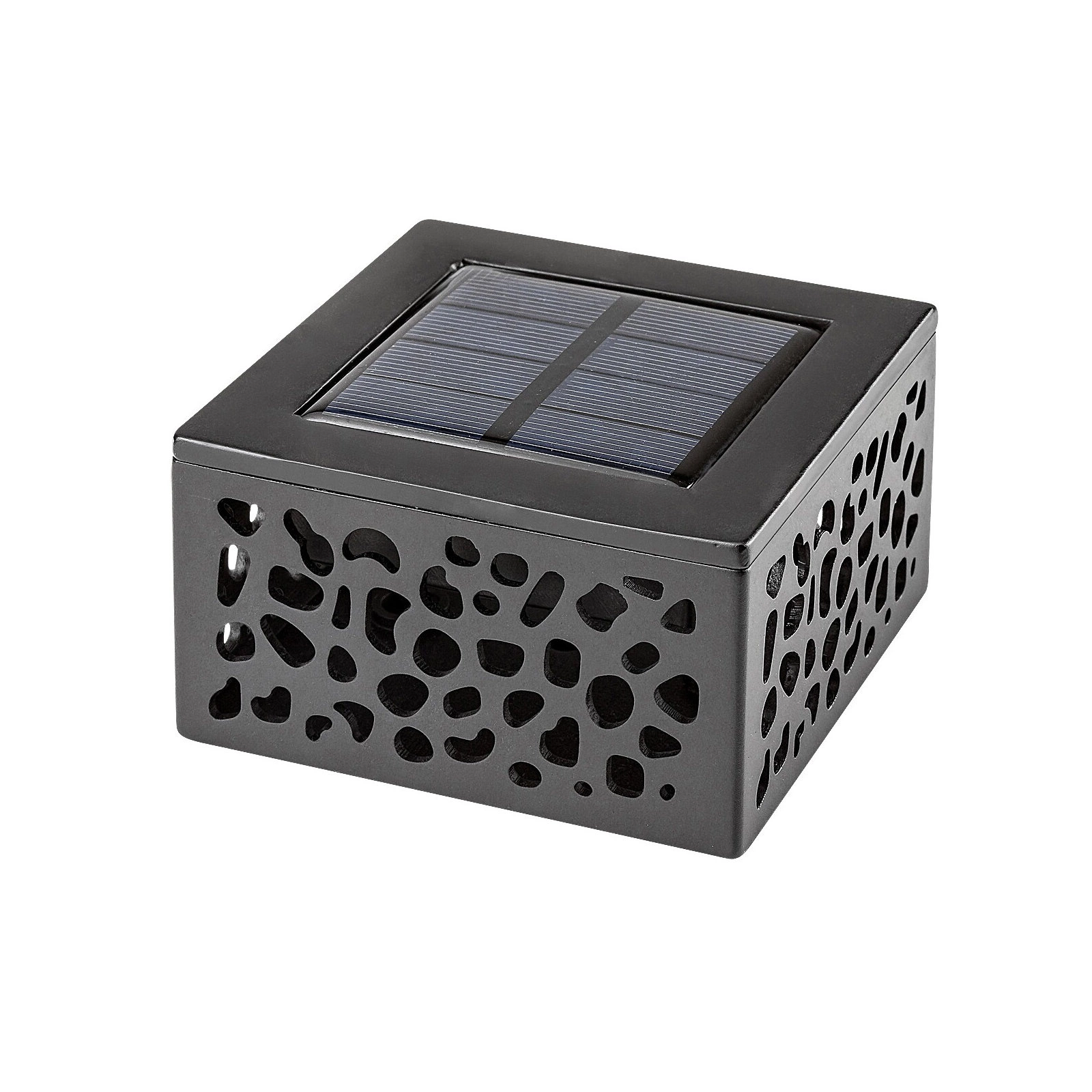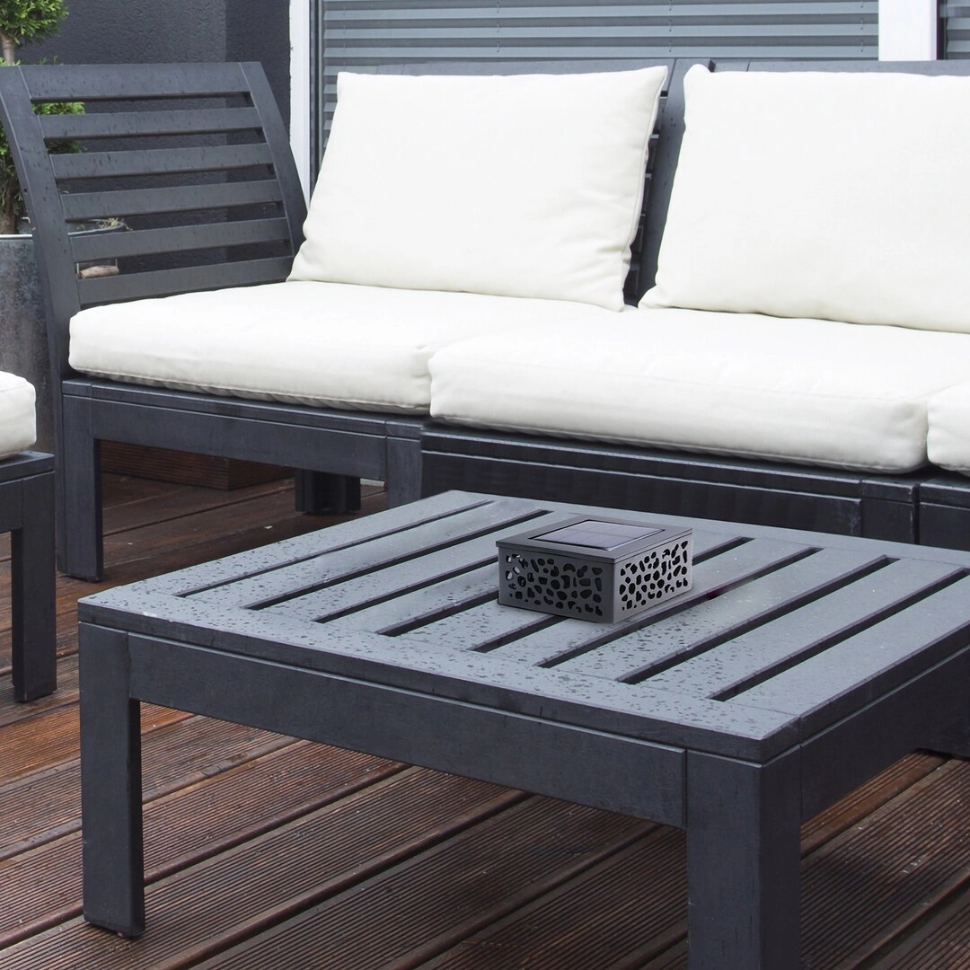Moderní čtvercová solární stolní lampa MEDULIN je zajímavé venkovní svítidlo napájené solární energií . Výhodou solárního napájení je absence drátů, nutnost připojování k síti a hlavně celoroční provozní náklady . Lampa je vyrobena z vysoce kvalitního plastu a má na vrchní straně solární panel . Vyniká ozdobnými výřezy v rámu, které díky hře světla a stínu dodají okolí jedinečnou atmosféru. Stupeň krytí je IP44 , který zajišťuje těsnost proti vniknutí předmětů o maximálním průměru 1 mm a proti stříkající vodě z libovolného směru.