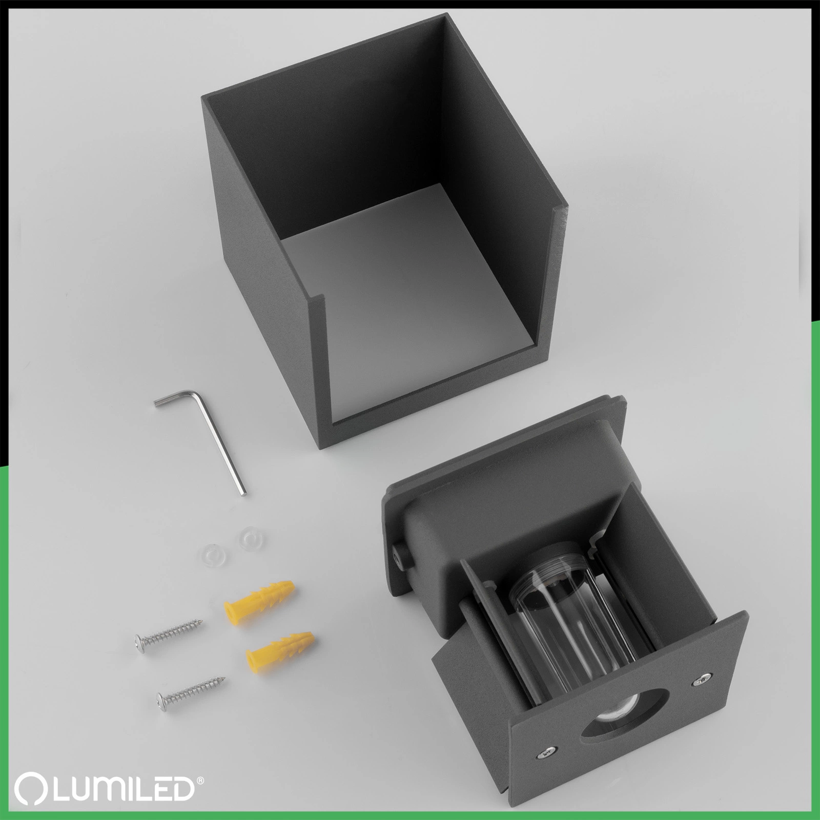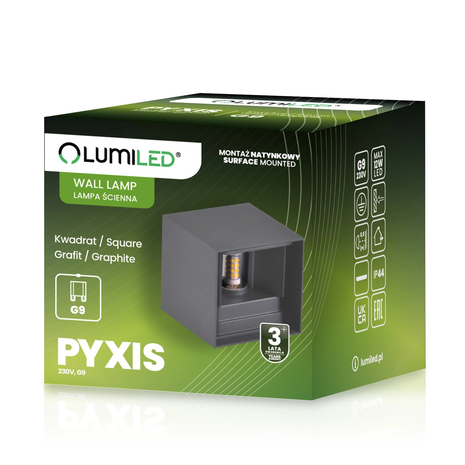 Venkovní nástěnná lampa, nástěnné svítidlo v barvě grafitové ze série PYXIS značky LUMILED se vyznačuje především moderním vzhledem a bezproblémovou montáží. Svítidlo je elegantní a praktické osvětlení, ideální pro použití venku. Určeno k povrchové montáži na fasády budov.