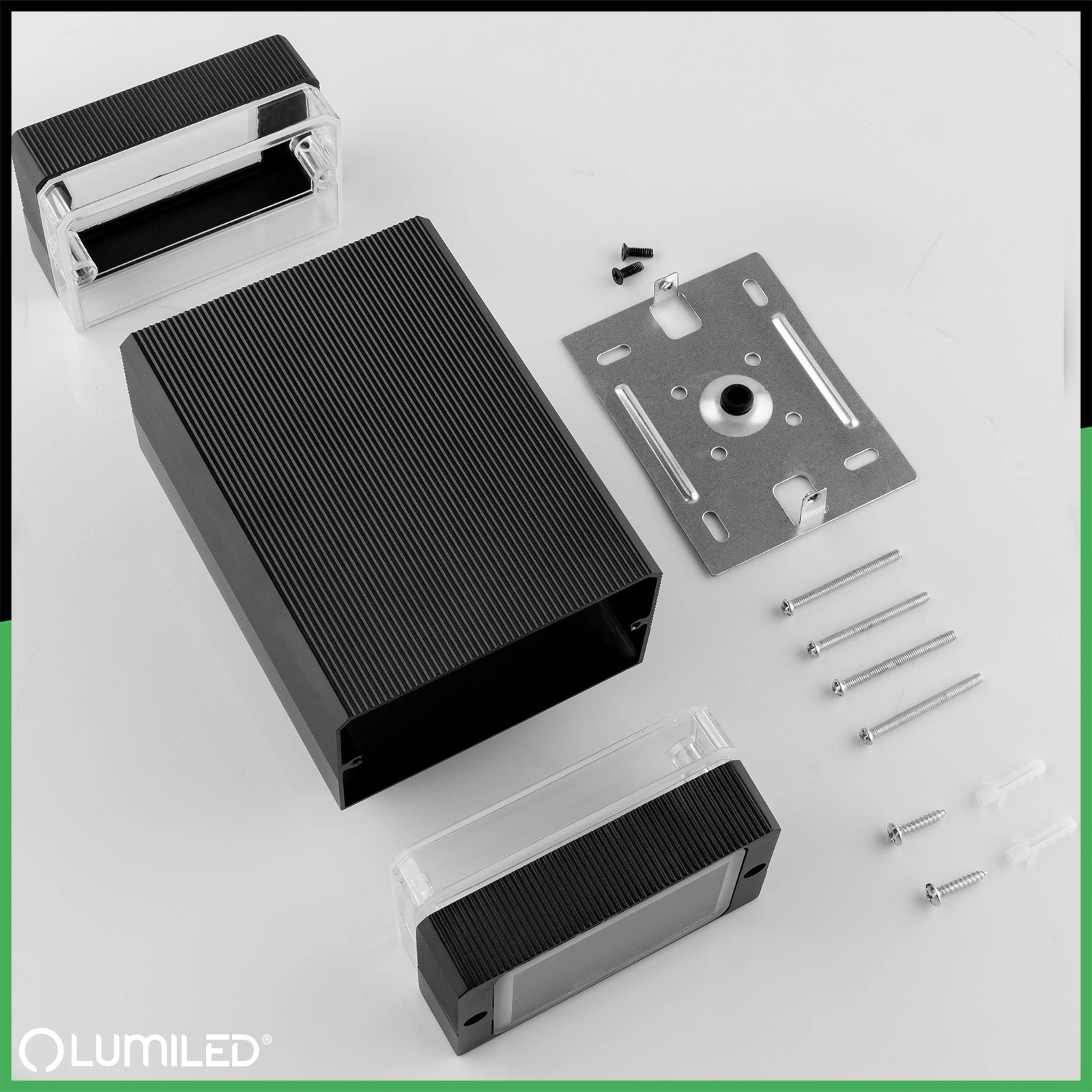 Zahradní nástěnné svítidlo, nástěnné svítidlo v černé barvě ze série HEDERA od společnosti LUMILED se vyznačuje především moderním designem a bezproblémovou instalací. Svítidlo je elegantní a praktické, ideální pro použití mimo domov. Určeno pro povrchová montáž na fasády budov. Zahradní lampa usnadní pohyb po pozemku ve večerních hodinách a nejenže ho osvětlí, ale také mu dodá kouzelnou atmosféru, která zpříjemní čas strávený na pozemku.