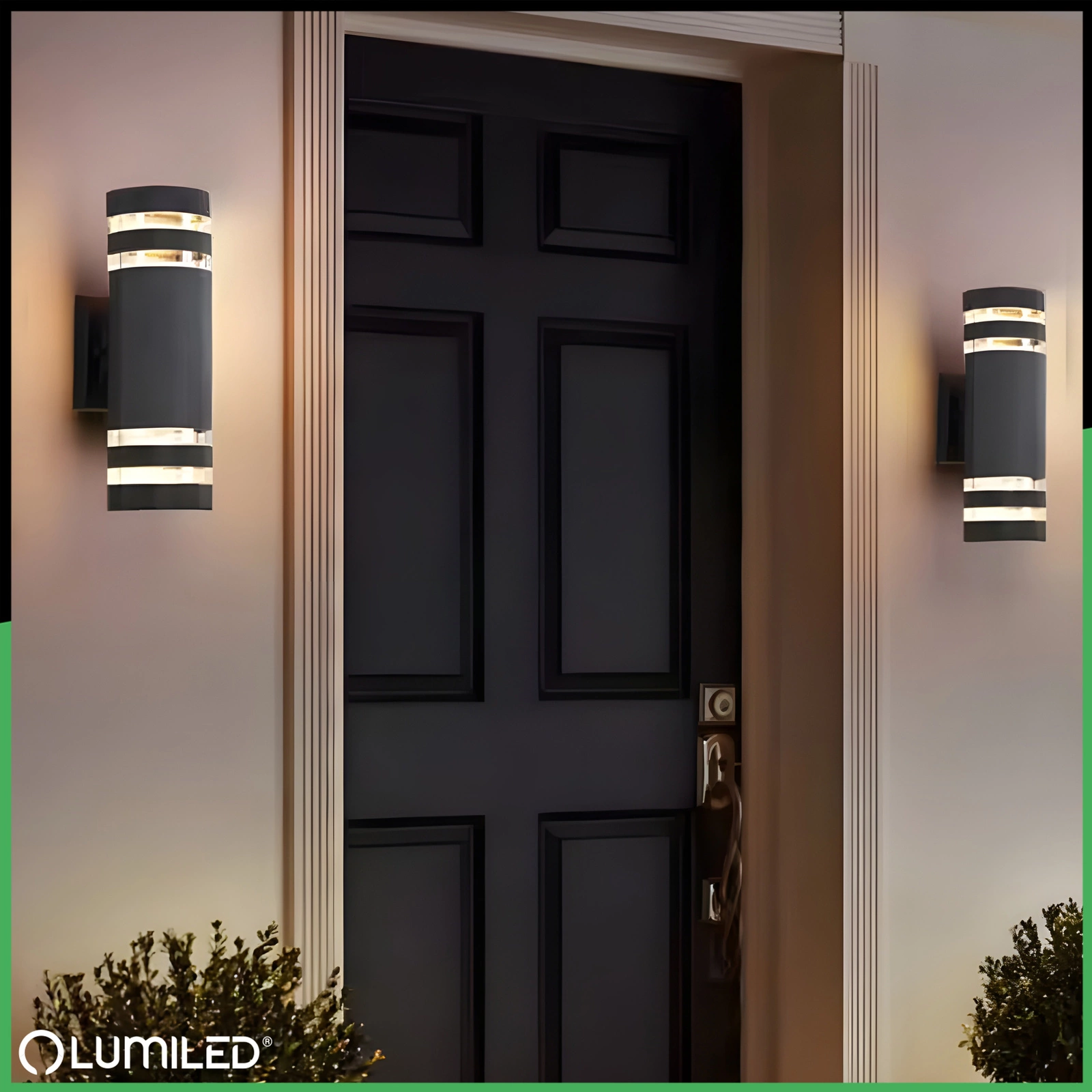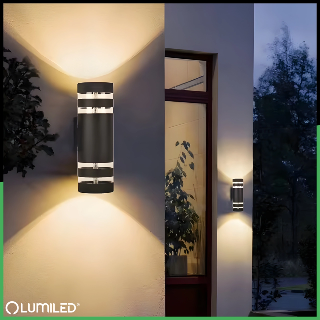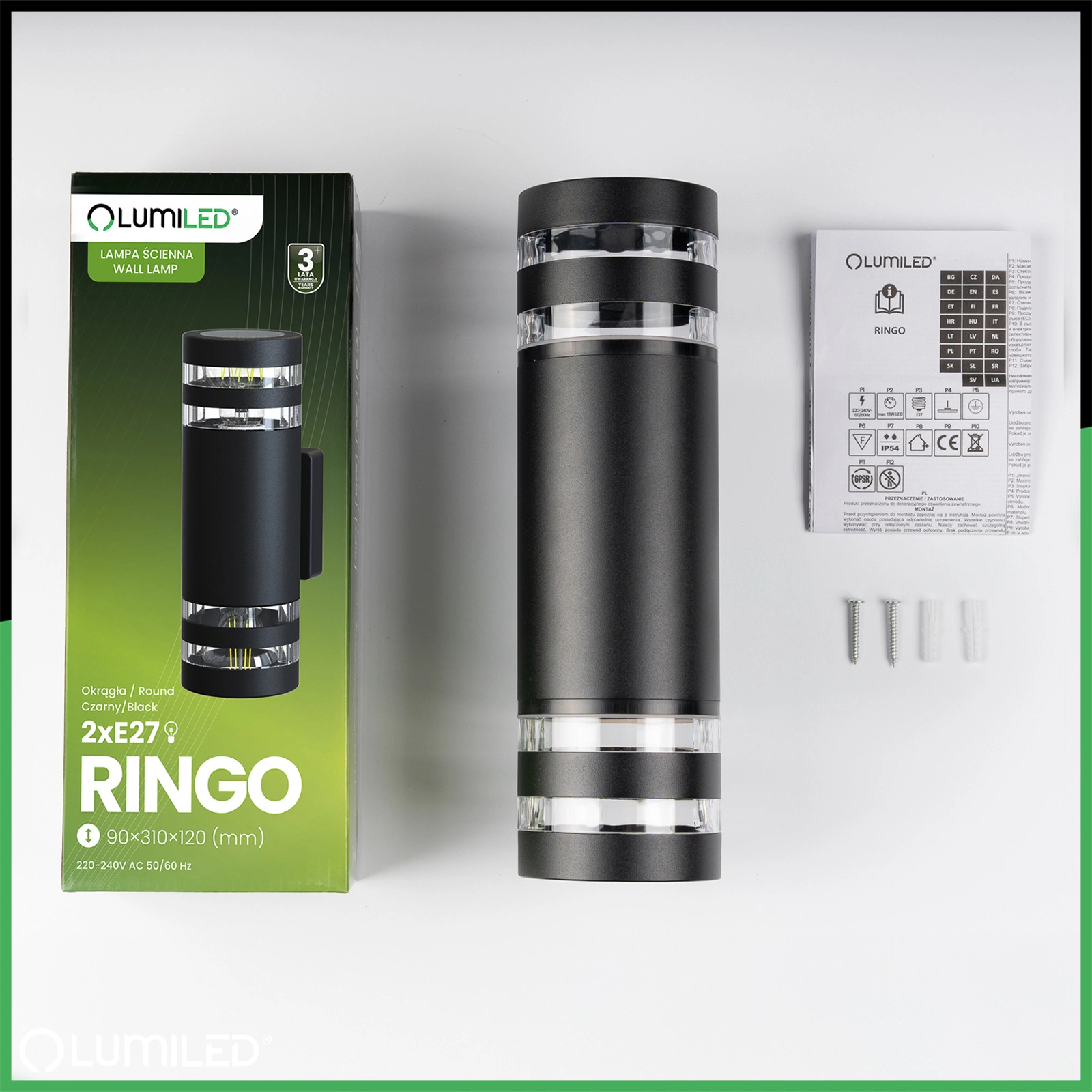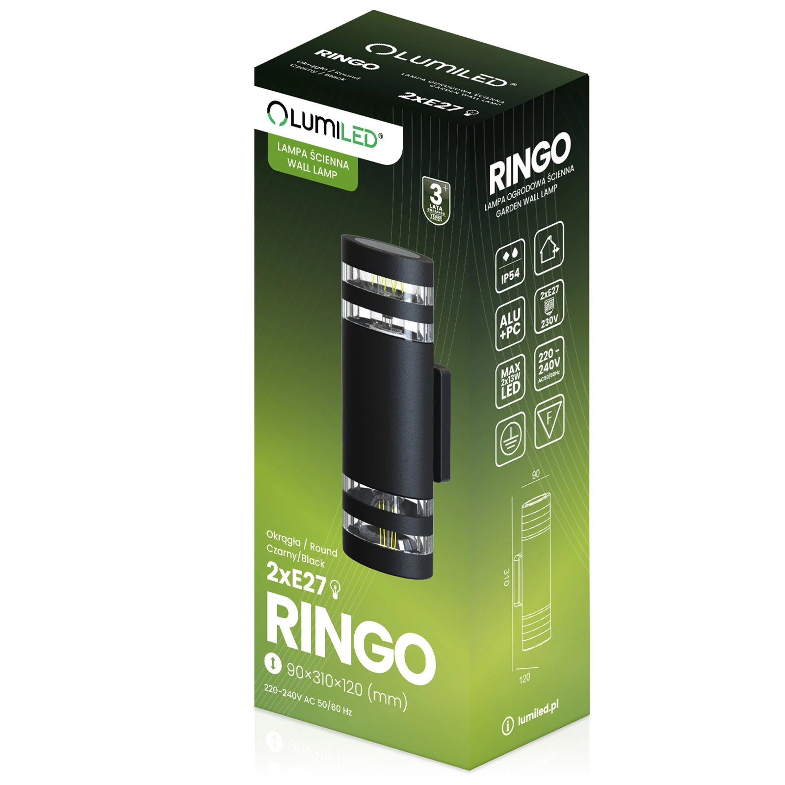 Zahradní nástěnné svítidlo, nástěnné svítidlo v černé barvě, série RINGO značky LUMILED se vyznačuje především moderním vzhledem a snadnou montáží. Svítidlo je elegantním a praktickým osvětlením, ideálním pro použití venku. Určeno k montáži na povrch fasád budov.