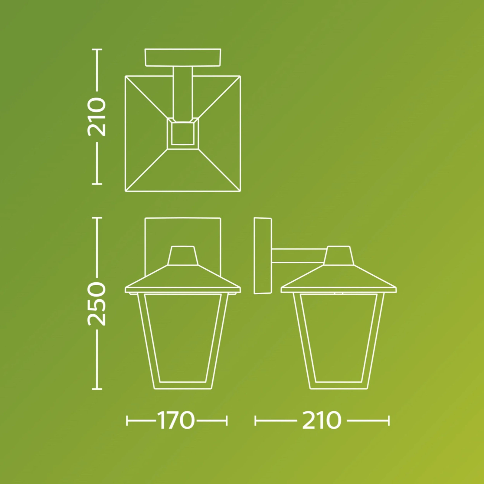 Zahradní nástěnná lampa Outdoor Lantern E27 IP44 Black Kinno od společnosti Philips je jedinečnou volbou pro ty, kteří hledají stylové a funkční venkovní osvětlení. Tato lampa je vyrobena z vysoce kvalitního hliníku a má klasickou černou povrchovou úpravu s matným povrchem, díky čemuž harmonicky zapadne do každého zahradního prostředí. Díky vodotěsnosti IP44 je odolná vůči povětrnostním vlivům a nabízí spolehlivý výkon po mnoho let. Tento model je navržen tak, aby fungoval s vyměnitelnými světelnými zdroji se závitem E27, což umožňuje přizpůsobit jas a teplotu barev.