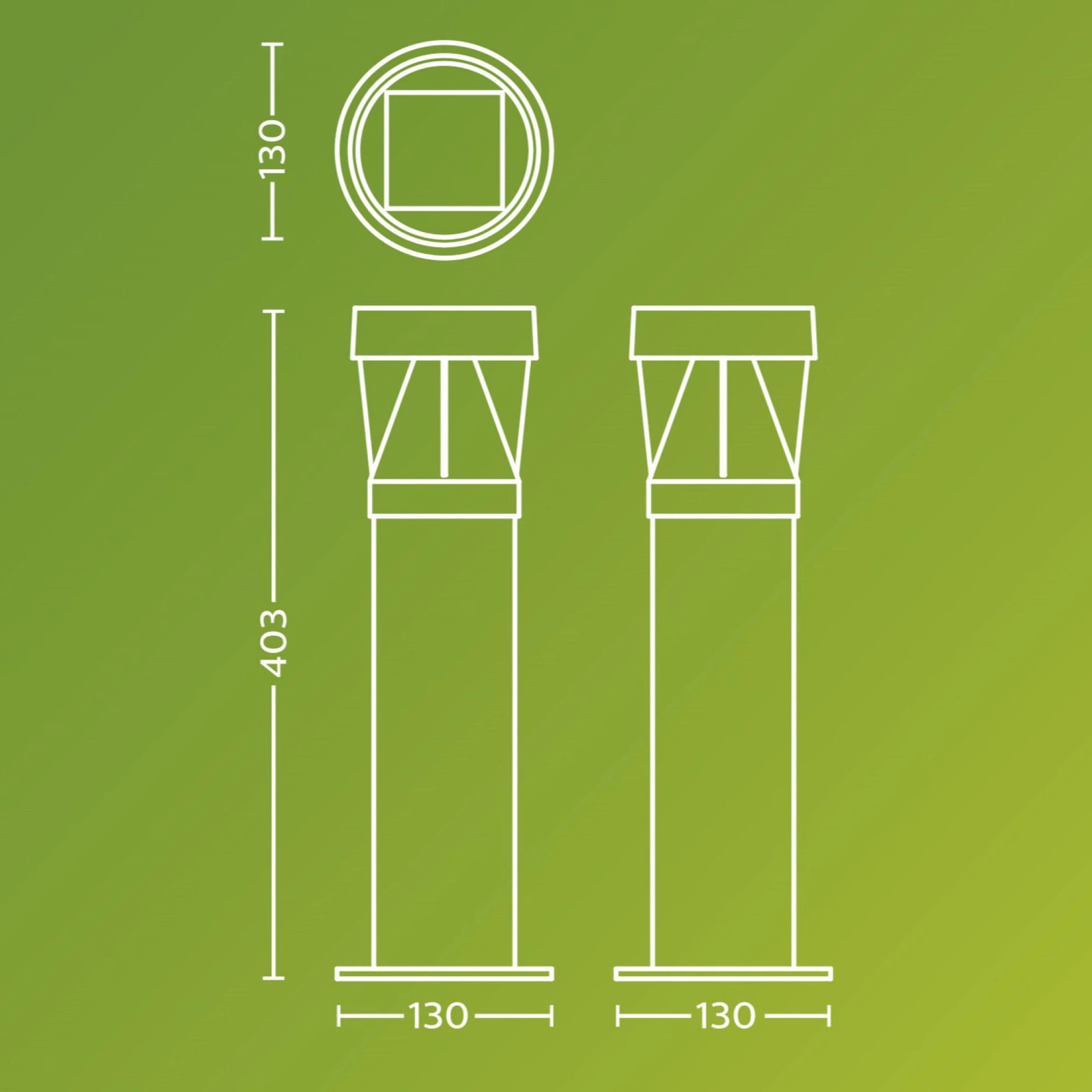 Tato venkovní lampa Philips byla speciálně navržena pro vlhké venkovní prostředí a přísně testována na vodotěsnost. Její stupeň krytí IP44 znamená, že byla certifikována pro ochranu proti prachu a stříkající vodě - je tedy ideální pro běžné venkovní použití.