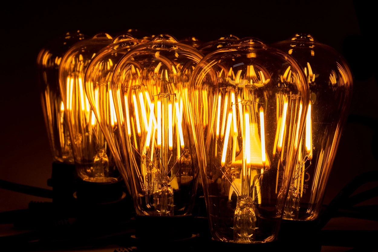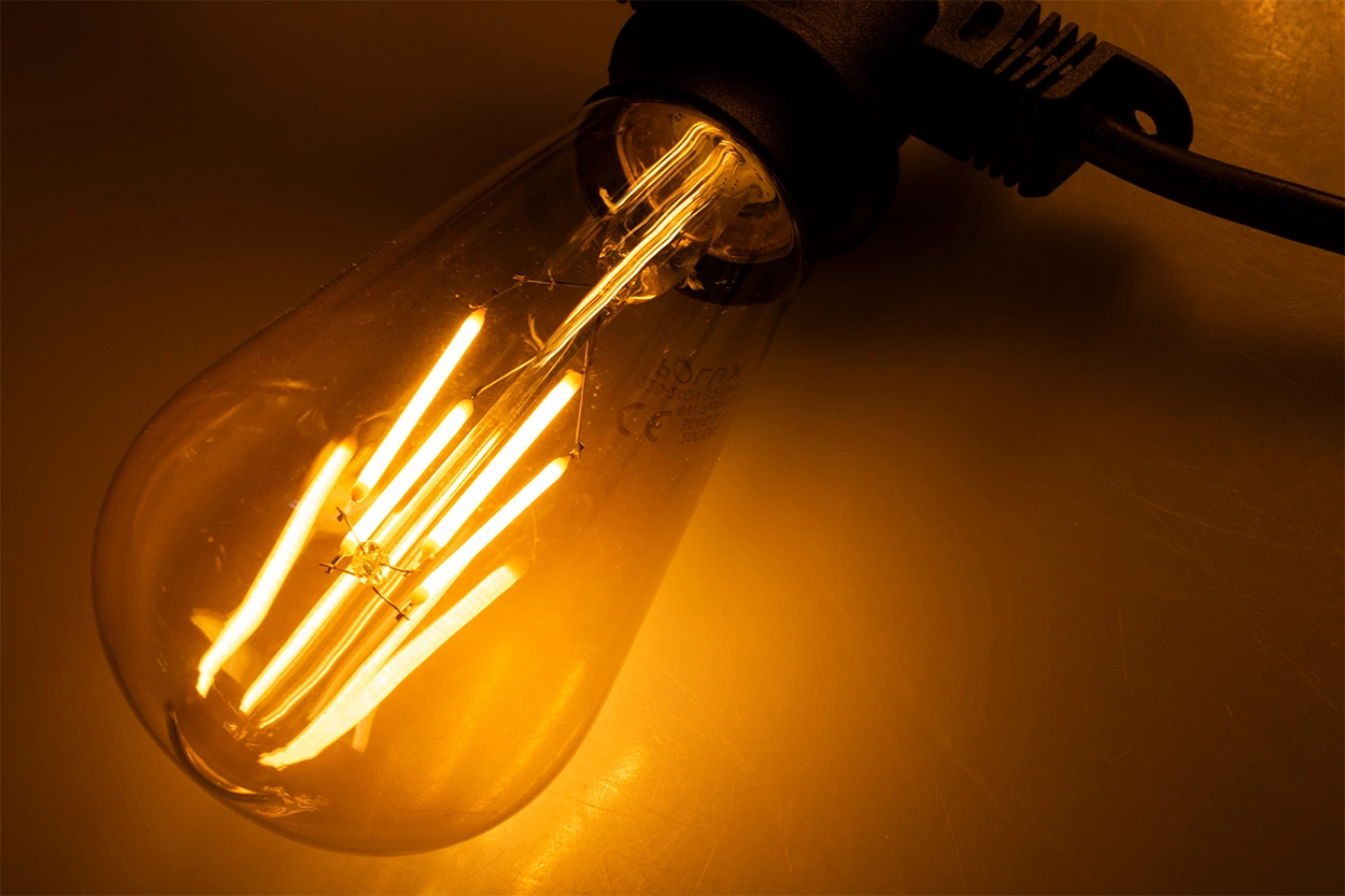 Patnáct metrů dlouhý světelný řetěz má položku pro 15 žárovek LED typu VINTAGE EDISON o závit E27 každých 100 cm.