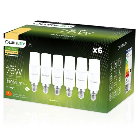 Sada 6 ks LED Stick od renomované a ve světelném průmyslu uznávané značky Lumiled o výkonu 10W (odpovídá klasické 75W žárovce) je kvalitní LED světelný zdroj se světelným tokem 1055lm a teplým světlem. barva 3000K. Série žárovek STICK se vyznačuje malým stínidlem, které vydává příjemné světlo a zároveň se díky své velikosti (113x36mm) vejde prakticky do každého svítidla se závitem E14.