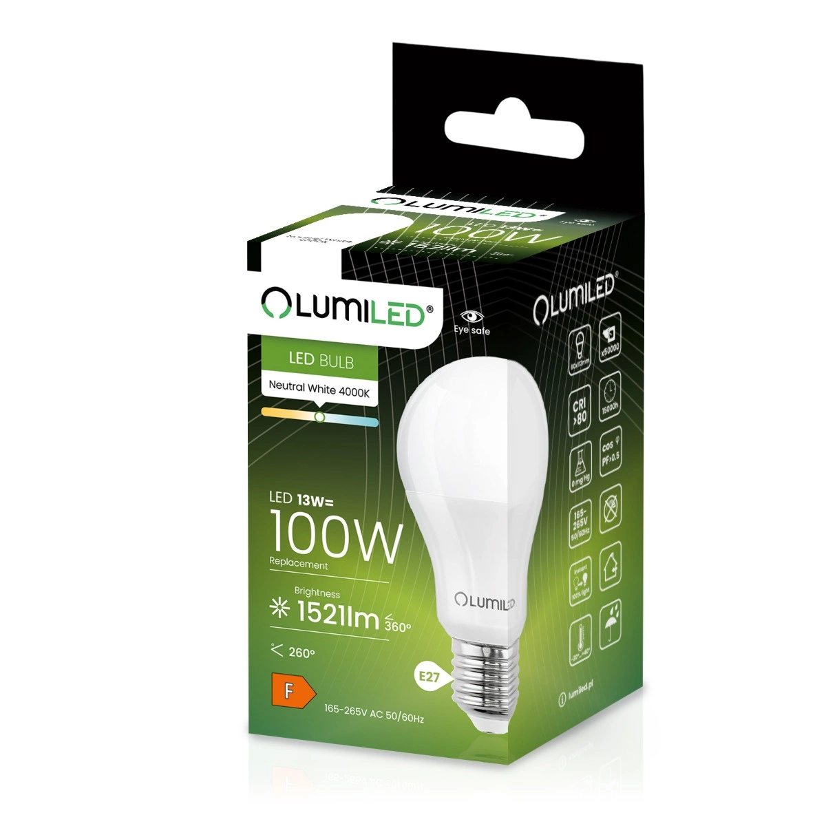 E27 A60 LED žárovka 13W = 100W 1521lm 4000K Neutrál 260° LUMILED
