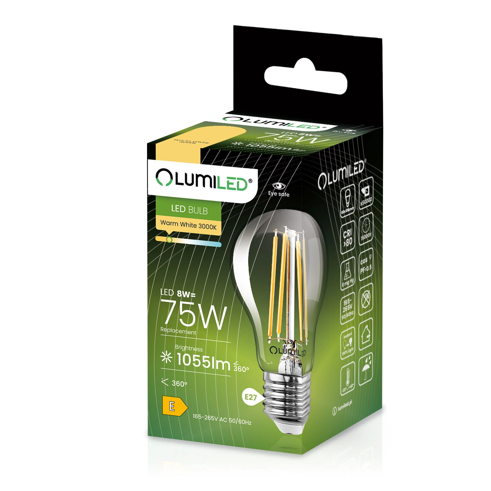 LED žárovka renomované a uznávané značky LUMILED ve světelném průmyslu ve tvaru klasické žárovky s paticí E27 a výkonem 8W. Žárovka je ideální pro každou domácnost, obchod, hotel nebo restauraci jako akcentační nebo dekorativní osvětlení a lze ji instalovat do všech tradičních svítidel vybavených paticí E27.