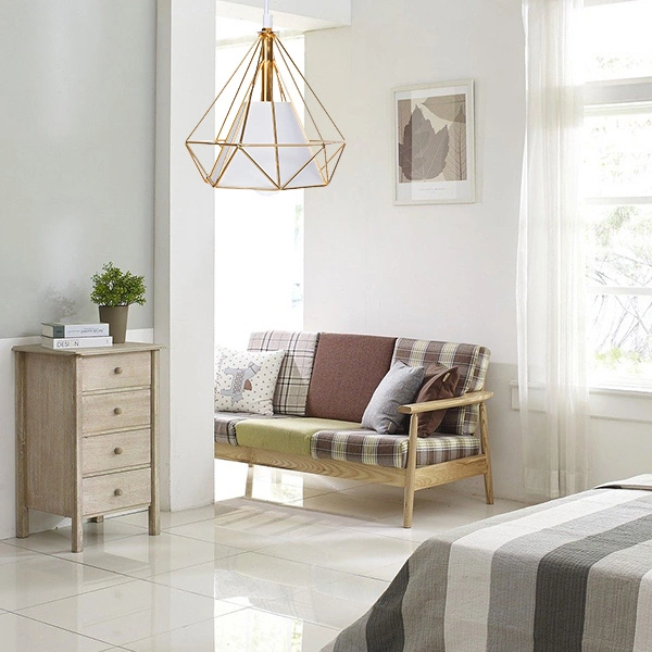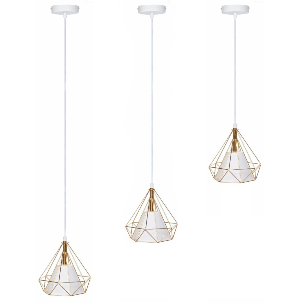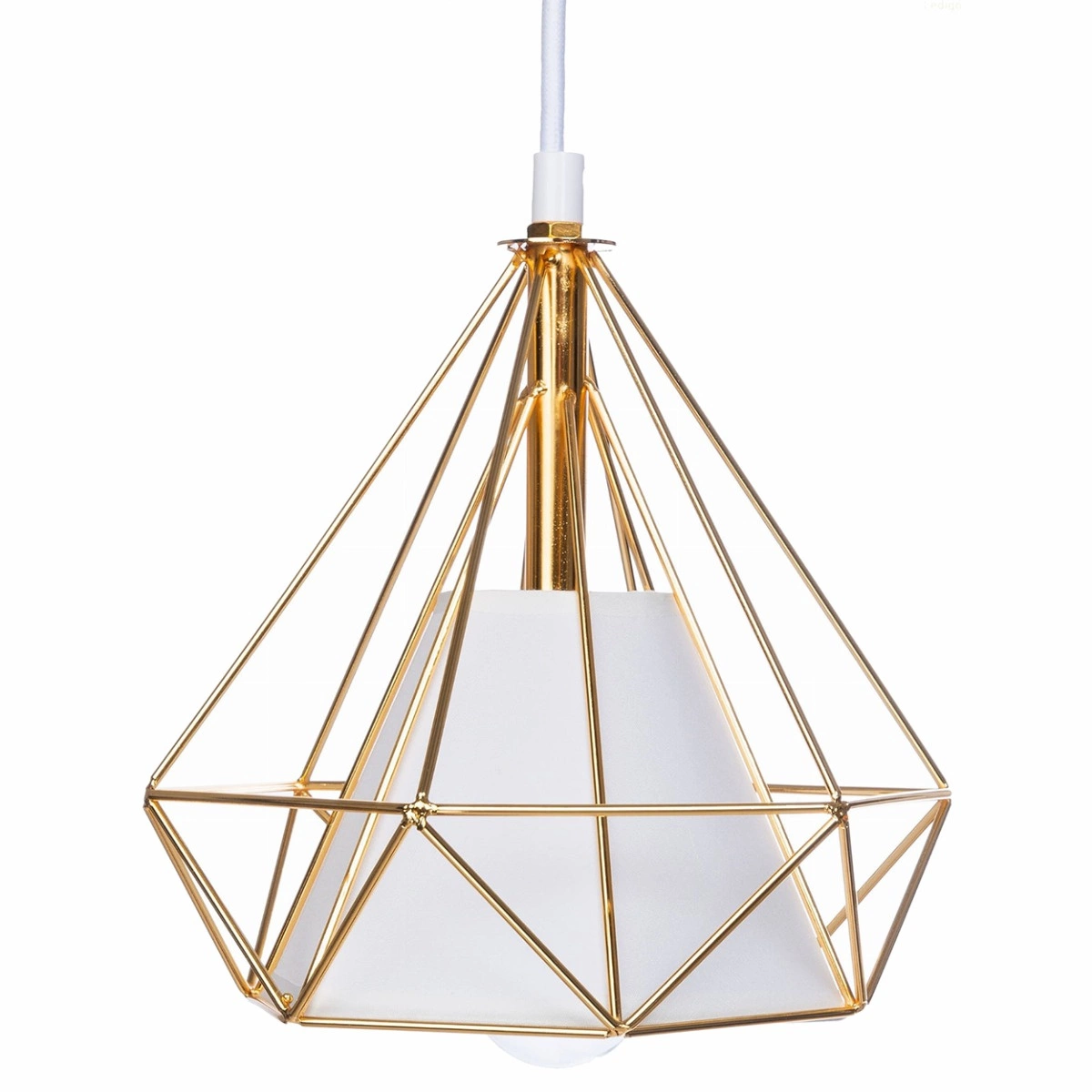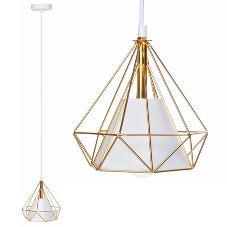 Industriální model závěsné lampy s jedním světelným zdrojem ve tvaru prolamovaného diamantu dodá vašemu interiéru originální a jedinečný charakter. Vzhledem k tomu, že lampa má integrované, matné, bílé stínidlo namontované uvnitř drátěného stínidla, vyzařované světlo neurazí, ale jemně pronikne do interiéru místnosti. Jedinečná kombinace ušlechtilého zlata s geometrickým tvarem stínidla dodává celé lampě velmi stylový a elegantní vzhled. Lampa umožňuje vytvořit individuální design interiéru. Tato lampa je perfektním produktem pro každého, kdo si chce vyzdobit svůj byt jedinečným a netradičním doplňkem, který podtrhne originální a avantgardní design interiéru. Vypadá skvěle v místnostech zařízených v industriálním, minimalistickém a moderním stylu
